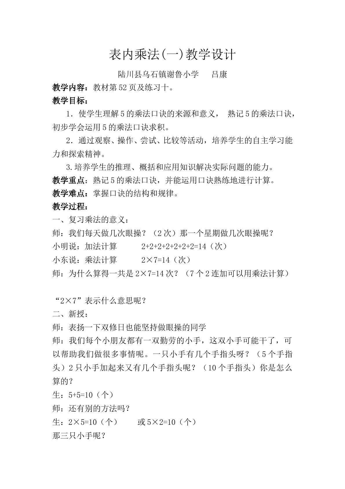 表内乘法(一)教案课件,表内乘法(一)是人教版小学二年级上册课程知识点。表内乘法(一)教案设计教学目标,使学生理解5的乘法口诀的来源和意义,熟记5的乘法口诀,初步学会运用5的乘法口诀求积。通过观察、操作、尝试、比较等活动,培养学生的自主学习能力和探索精神。培养学生的推理、概括和应用知识解决实际问题的能力。教学重点,熟记5的乘法口诀,并能运用口诀熟练的进行计算。