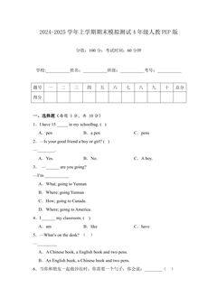 2024-2025学年上学期期末模拟测试01 -人教PEP版英语4年级上册