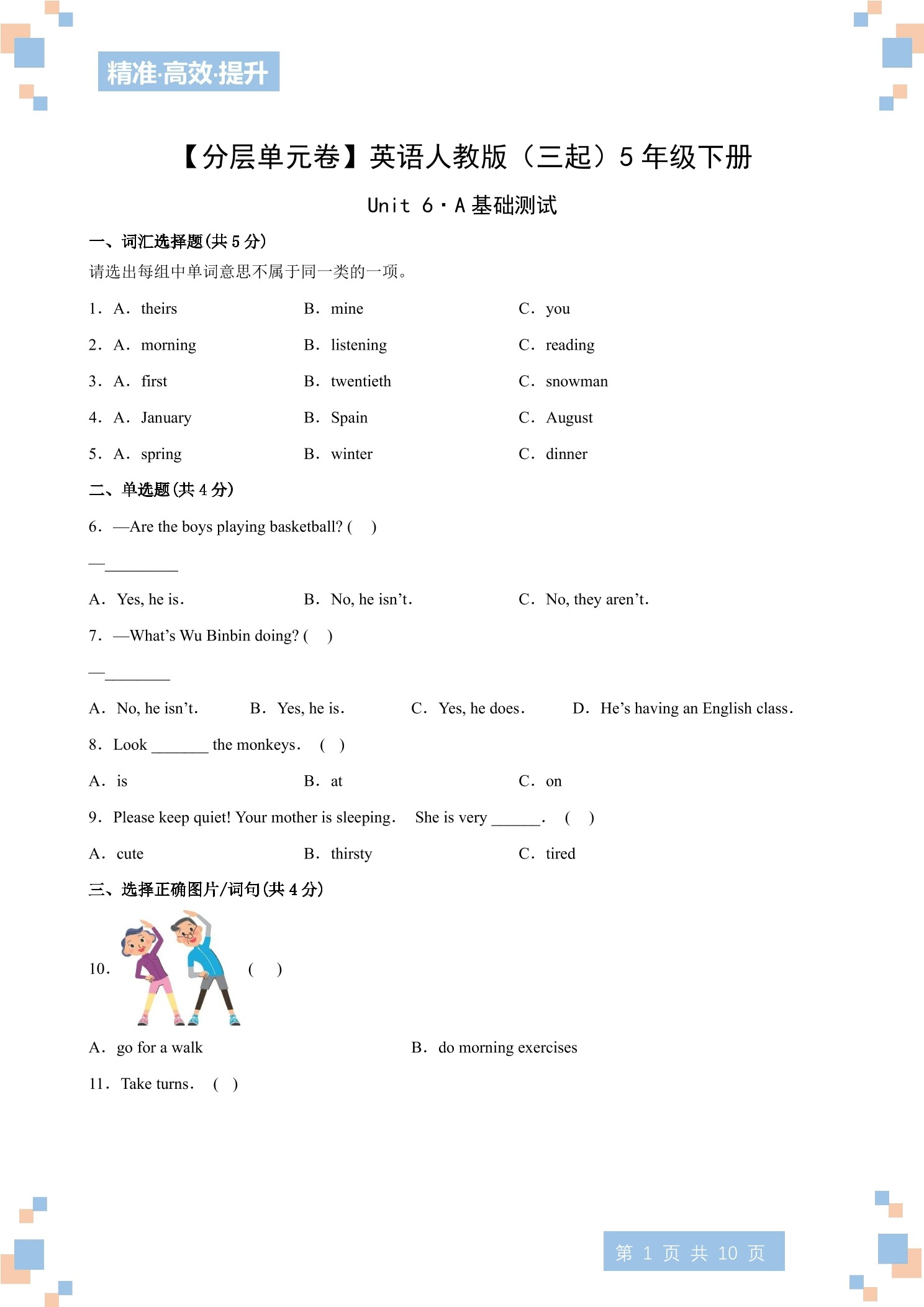 英语人教版(三起)5年级下册Unit 6【分层单元卷】·A基础测试