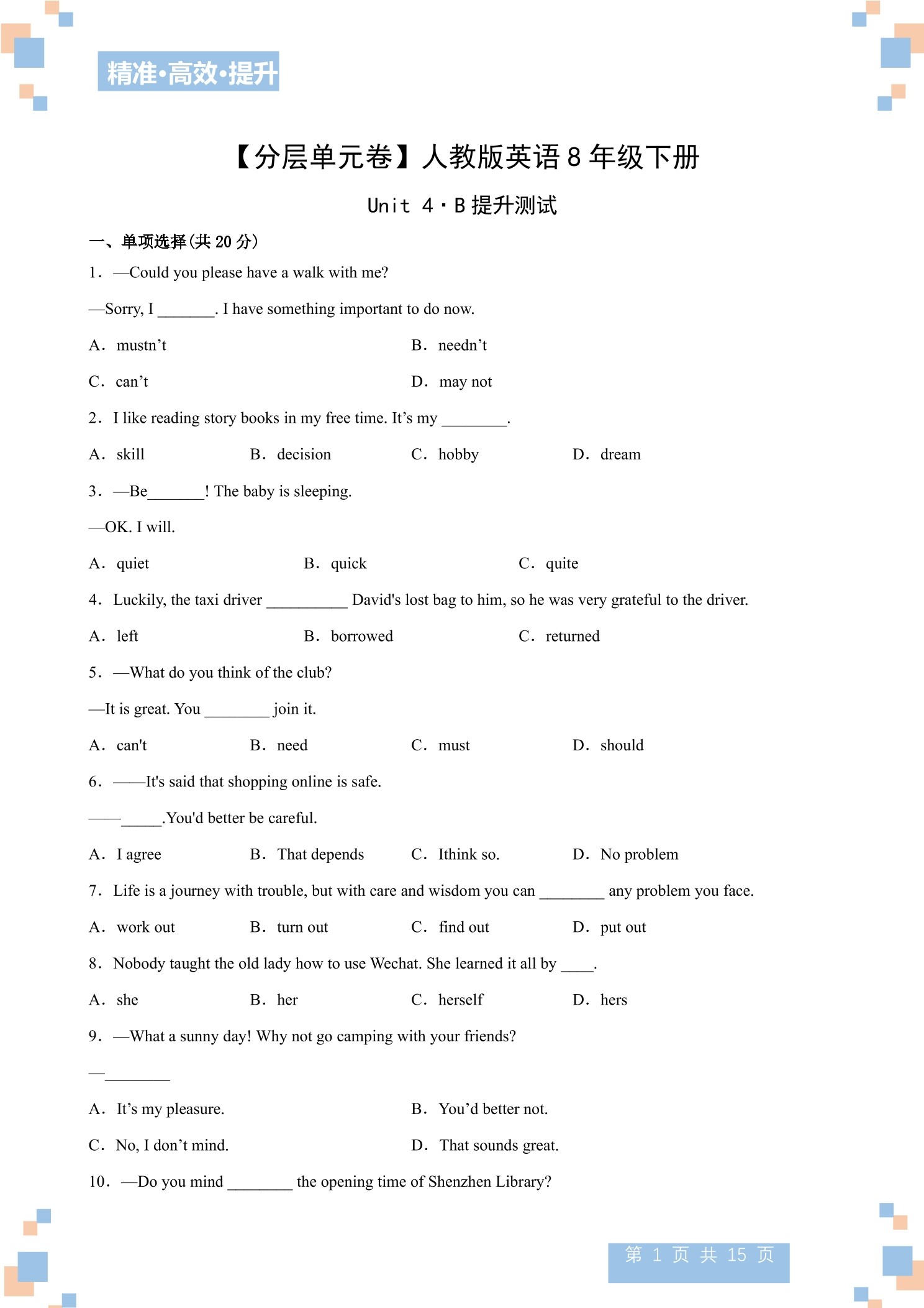 英语人教版8年级下册Unit4【分层单元卷】·B提升测试