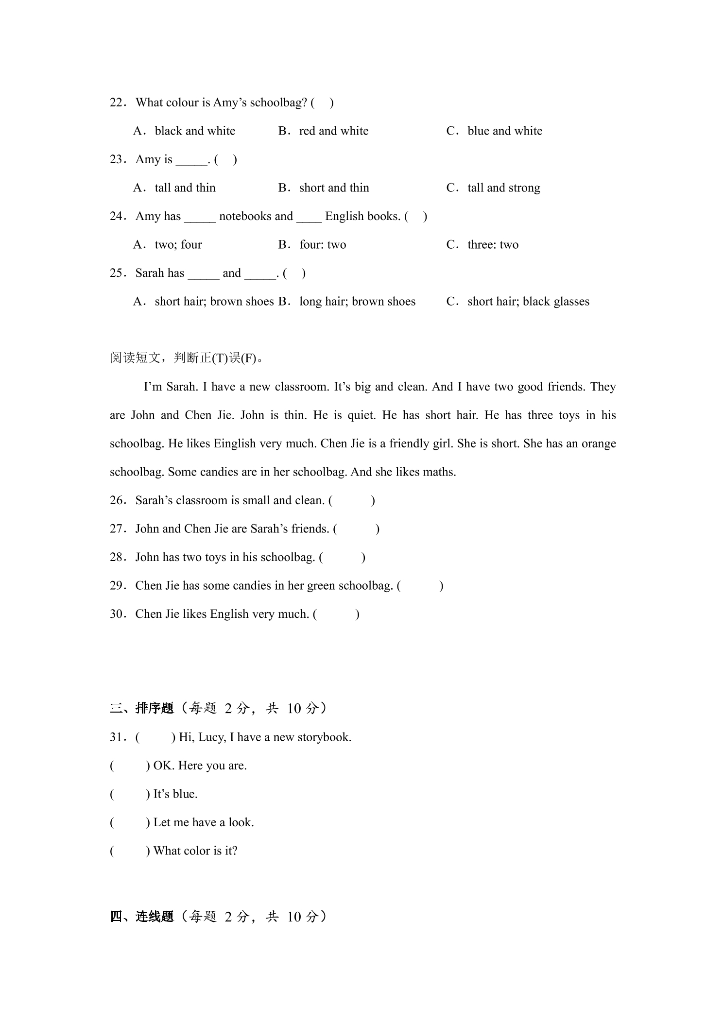 英语人教PEP版3年级上册Unit 1阅读理解