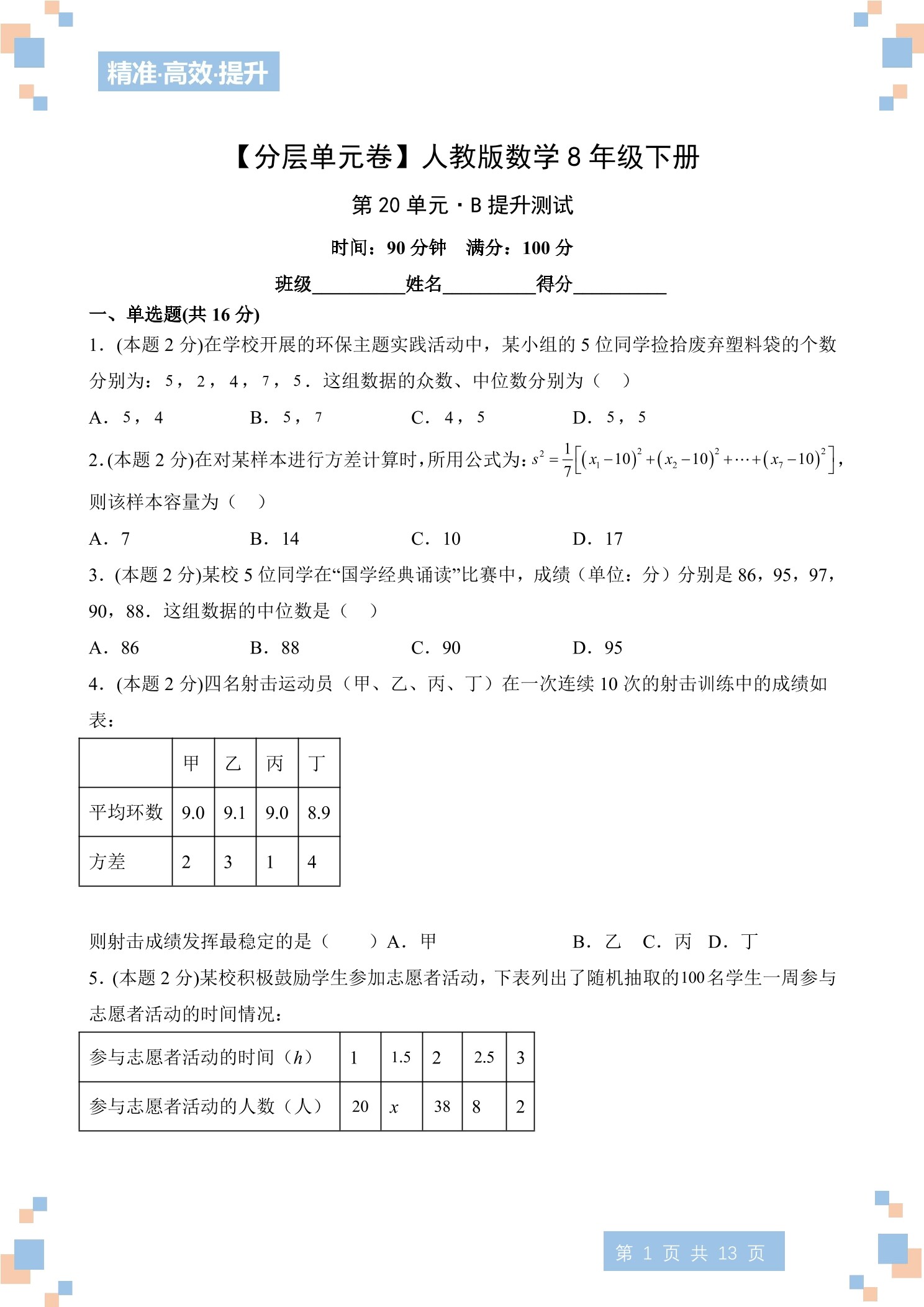【分层单元卷】人教版数学8年级下册第20单元·B提升测试