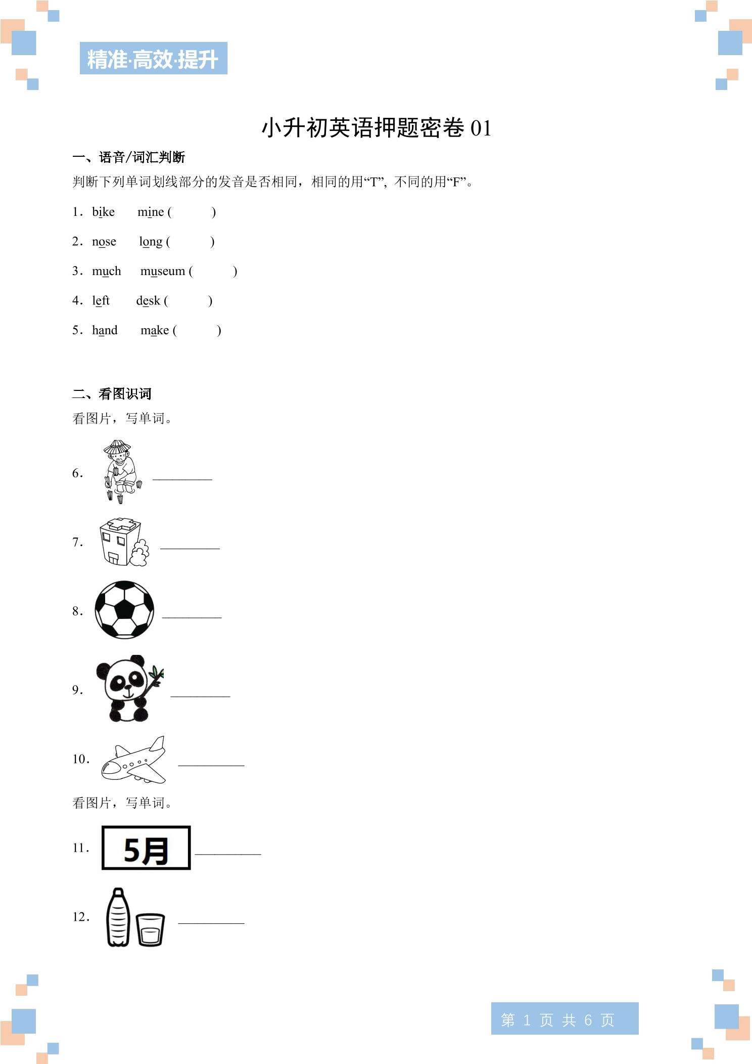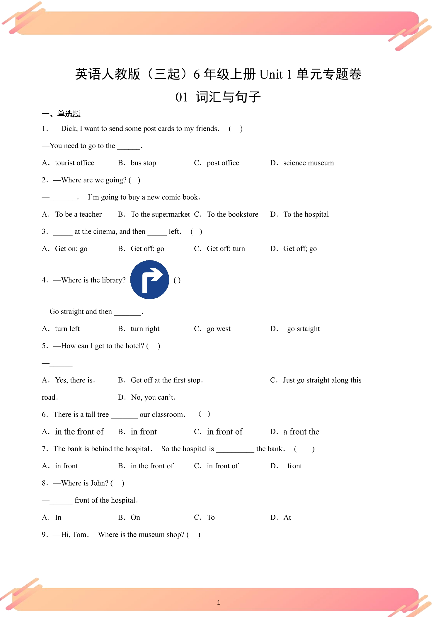 英语人教版(三起)6年级上册Unit 1单元专题卷01 词汇与句子