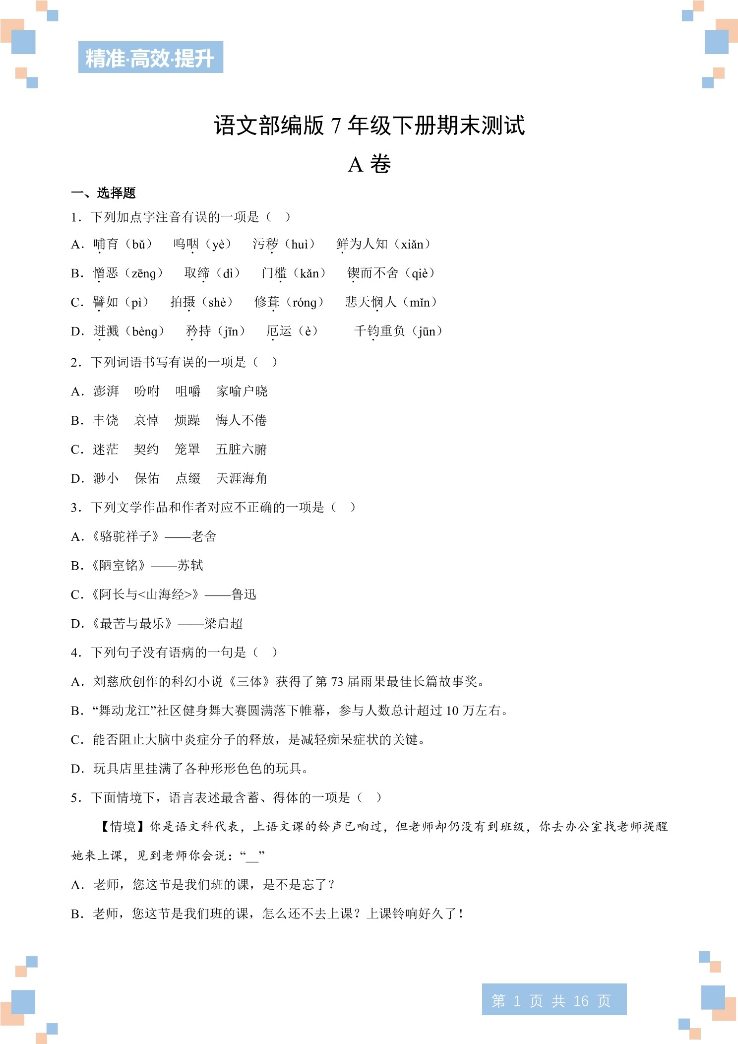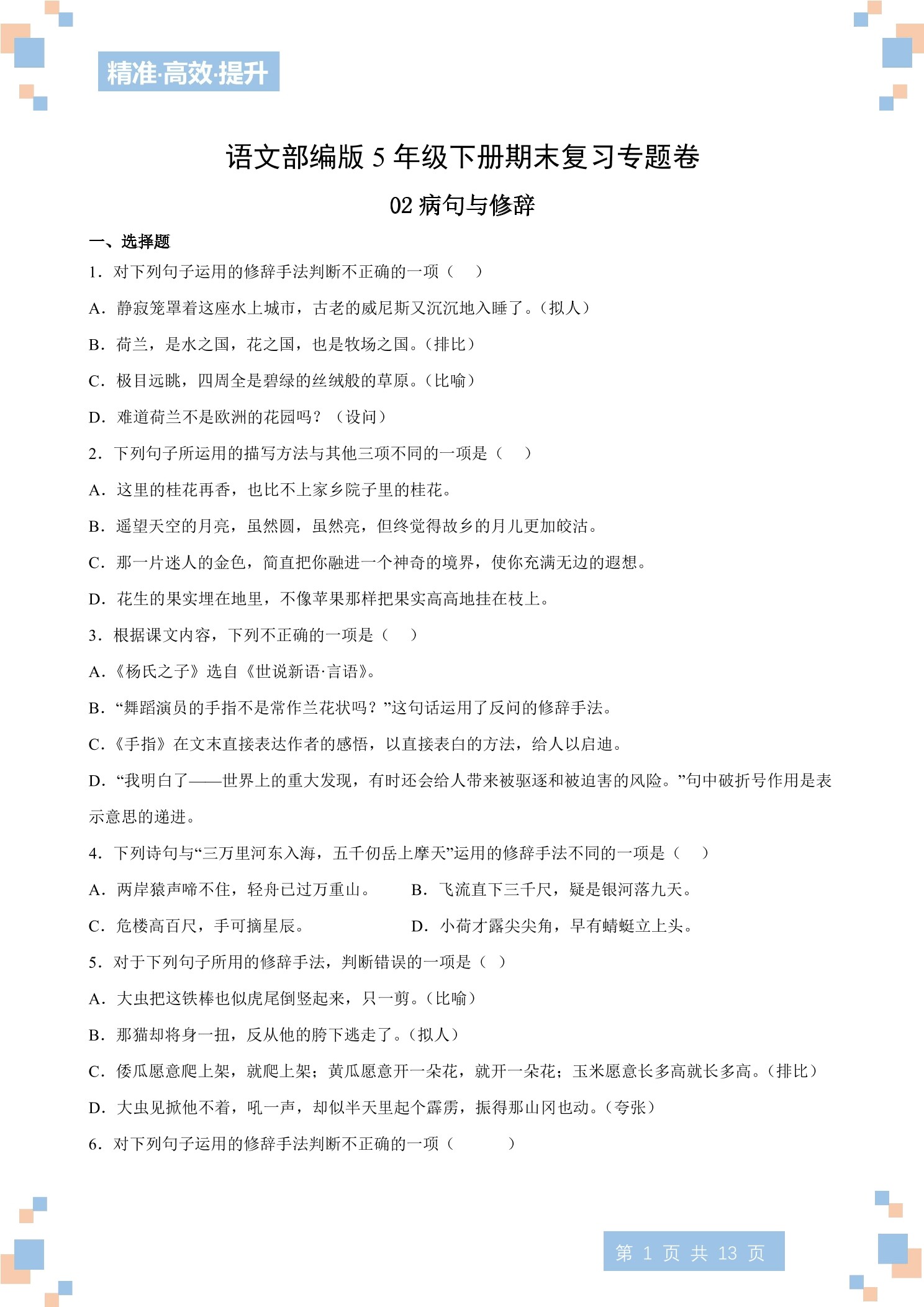 语文部编版5年级下册期末复习专题卷 02病句与修辞