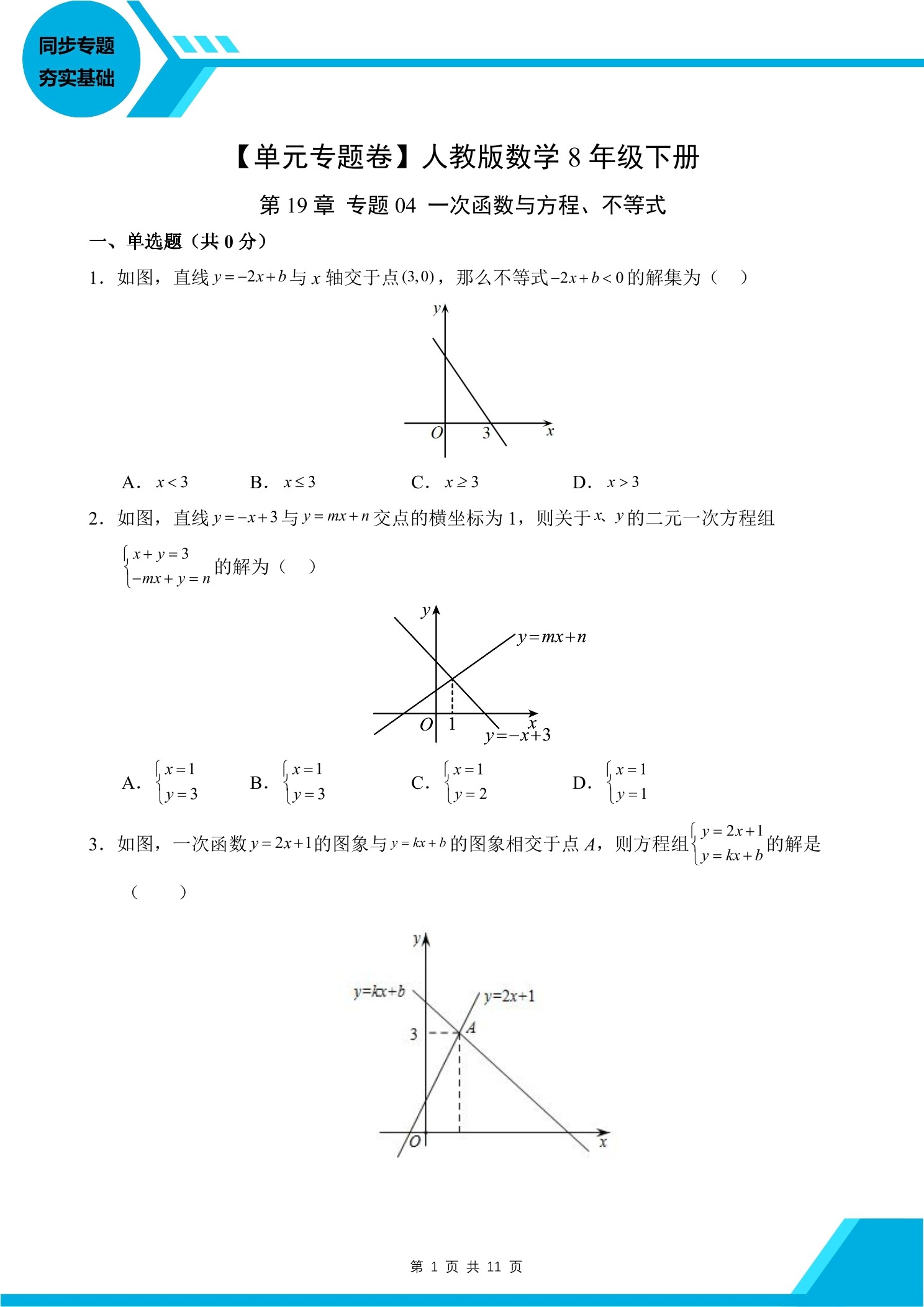 数学人教版8年级下册第19章【单元专题卷】专题04 一次函数与方程、不等式