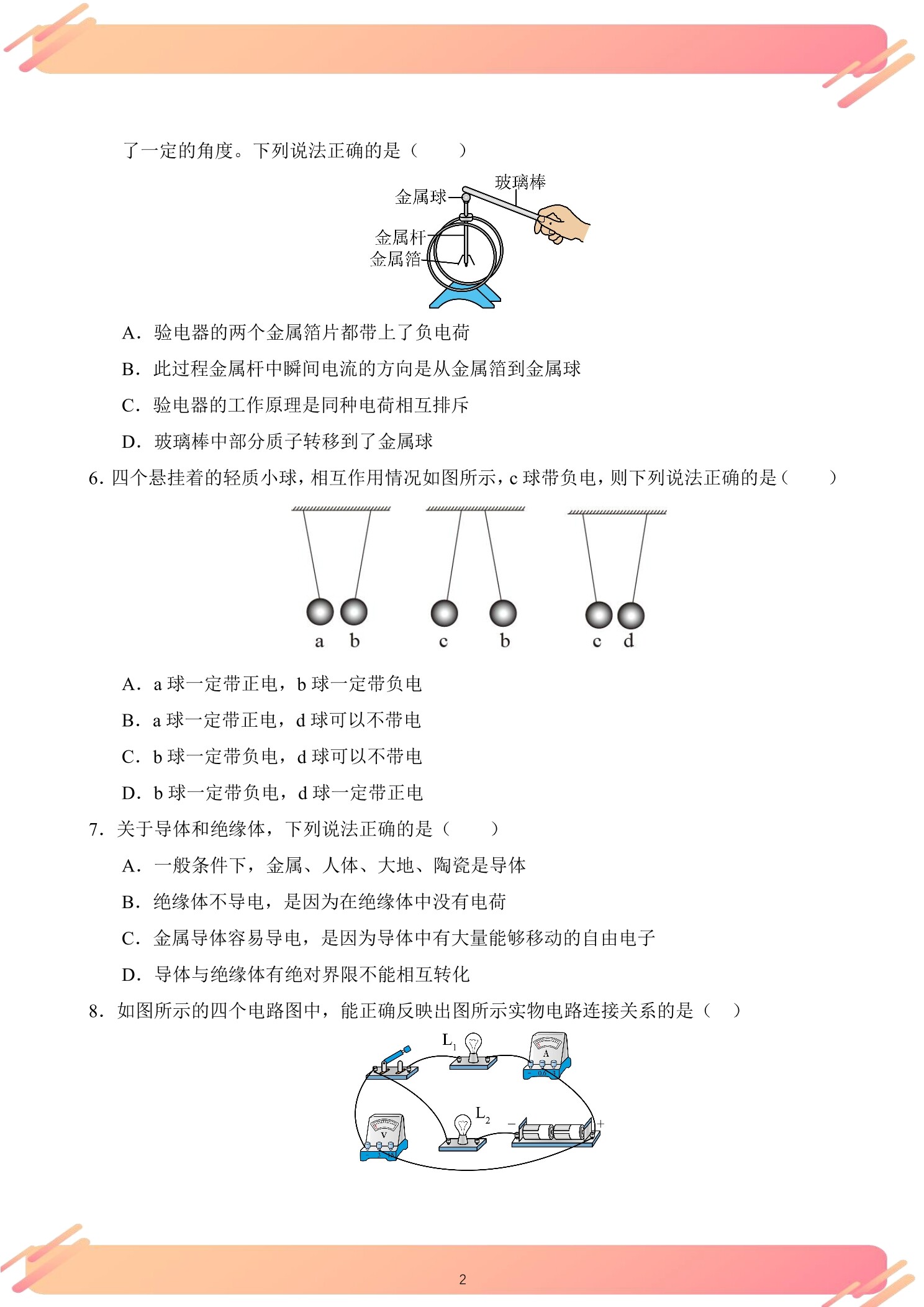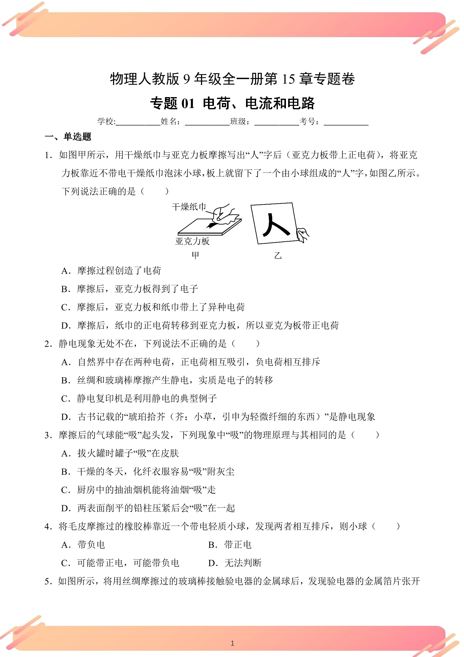 物理人教版9年级全一册第15章专题卷01 电荷、电流和电路