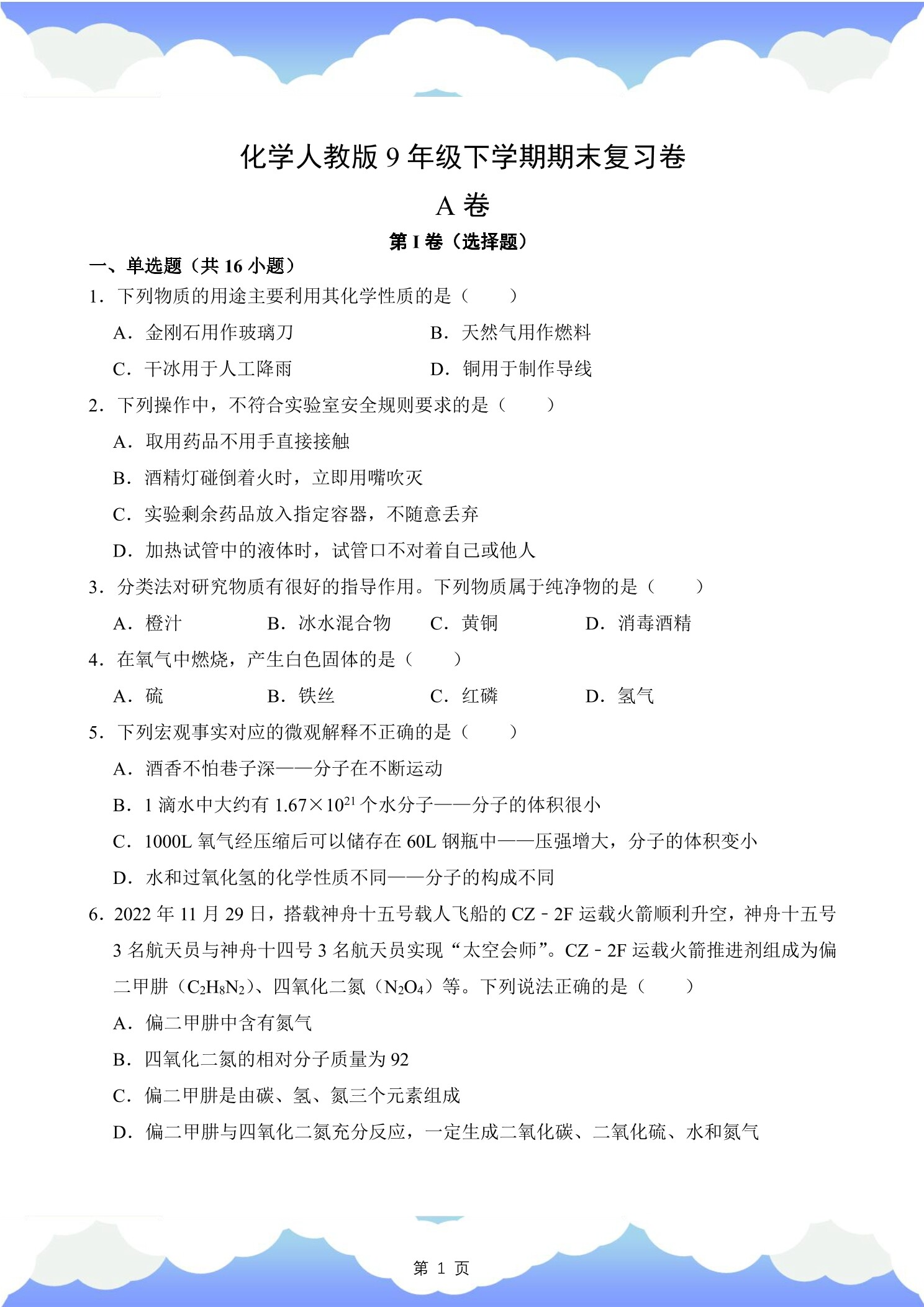 物理人教版9年级全一册第13章专题卷01 分子热运动 内能