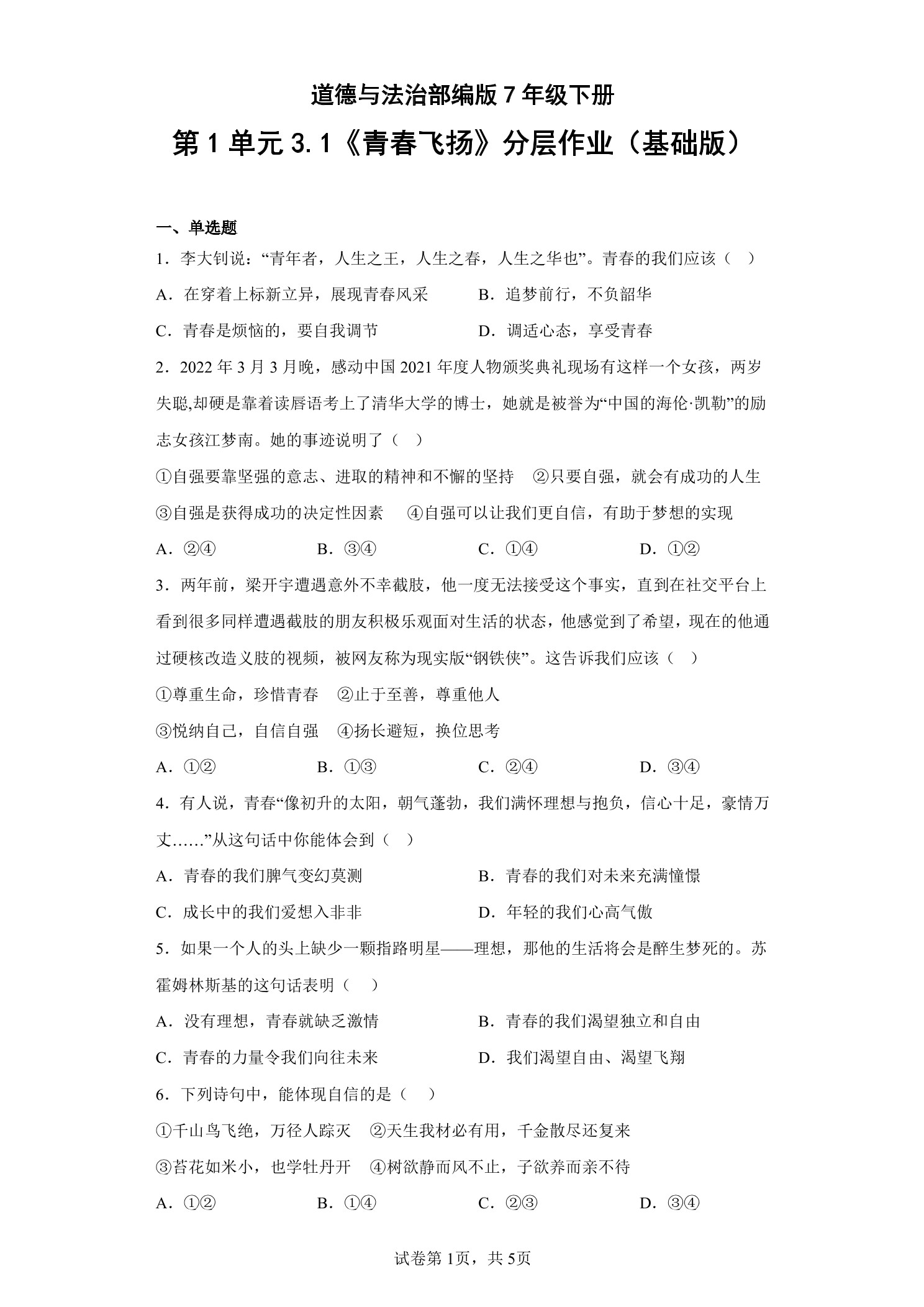 道德与法治部编版7年级下册第1单元3.1《青春飞扬》分层作业(基础版)