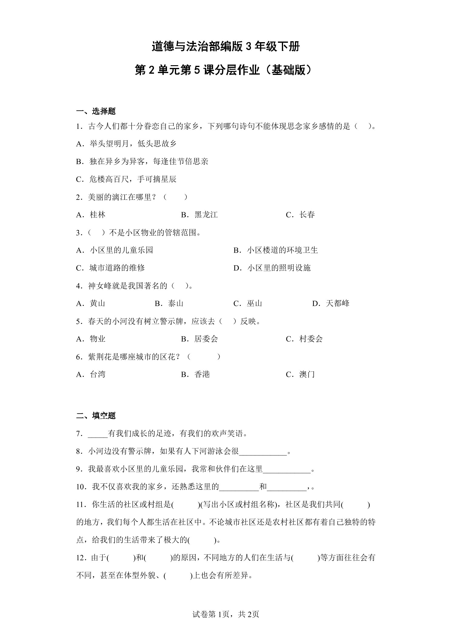 道德与法治部编版3年级下册第2单元第5课分层作业(基础版)