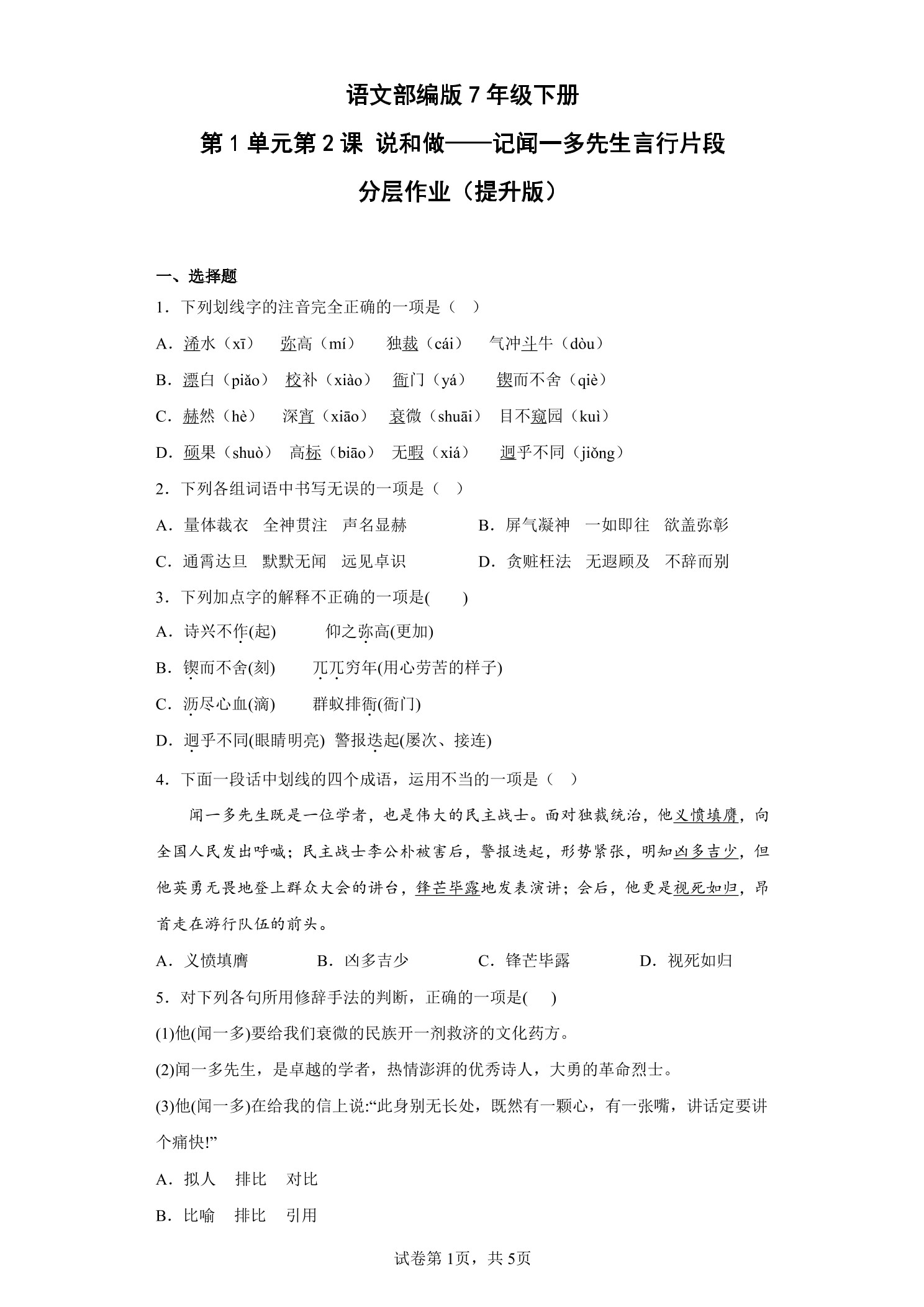 语文部编版7年级下册第1单元第2课说和做——记闻一多先生言行片段分层作业(提升版)