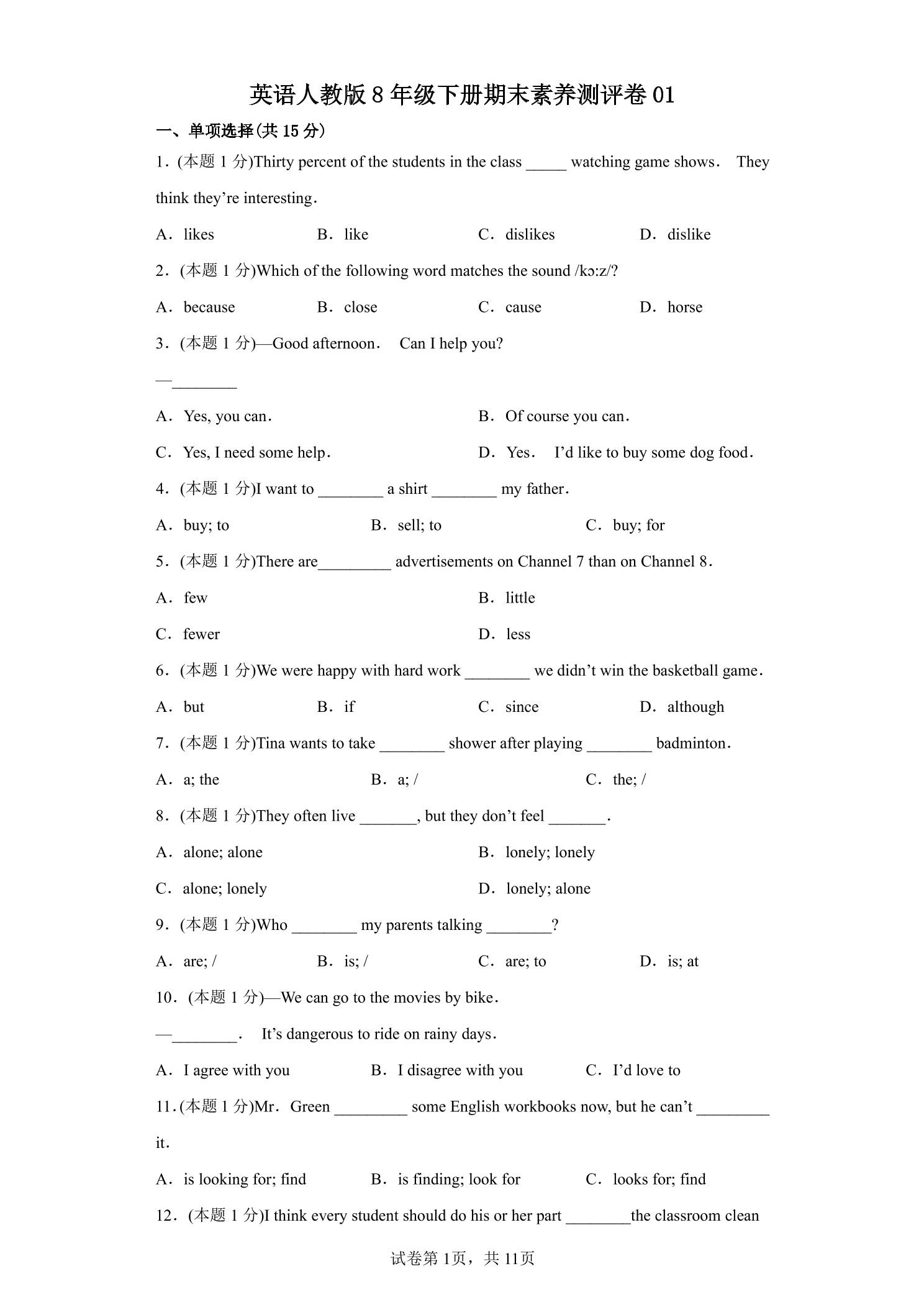 英语人教版7年级下册unit10【单元专题卷】专题02 阅读与写作