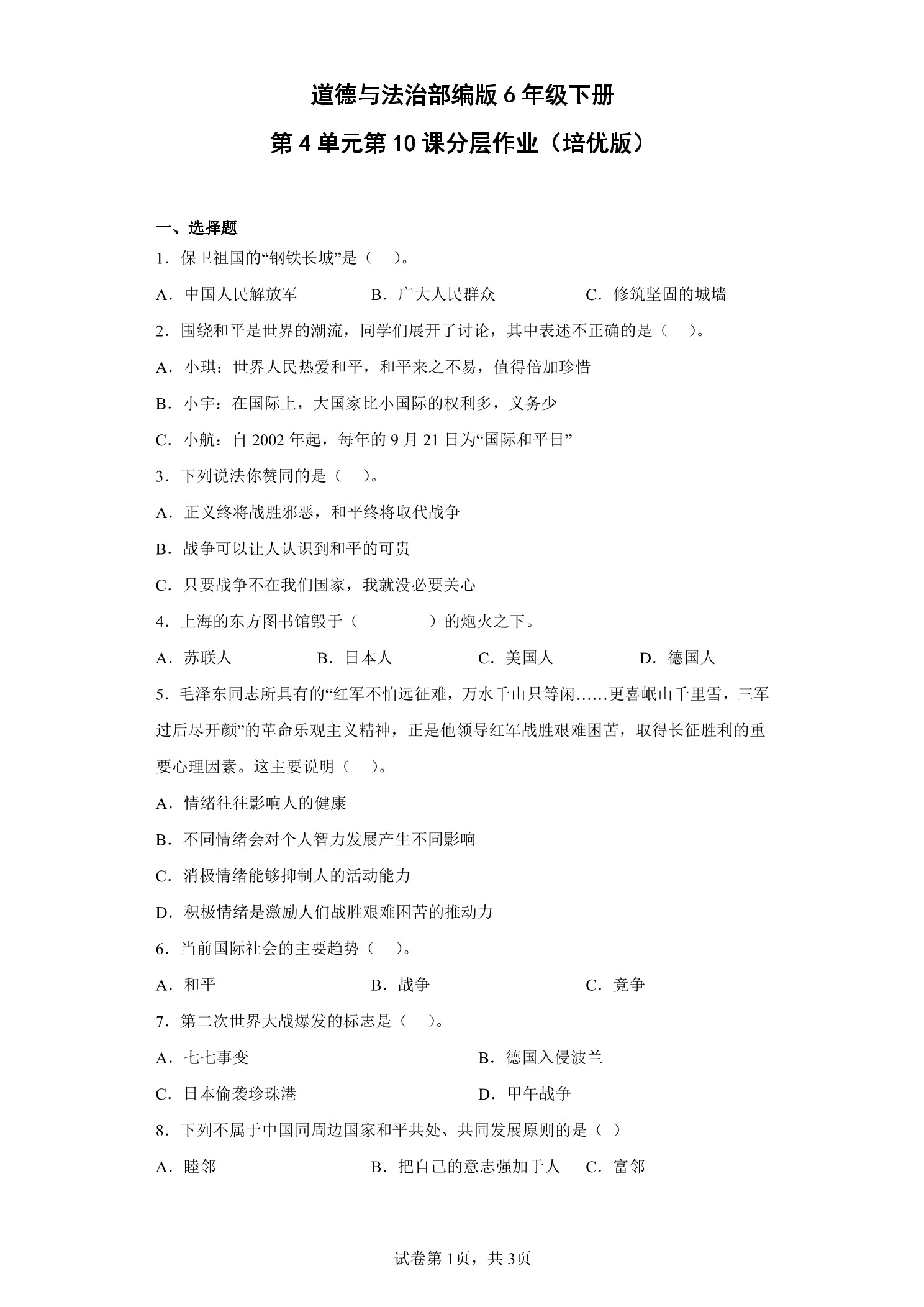 道德与法治部编版6年级下册第4单元第10课分层作业(培优版)