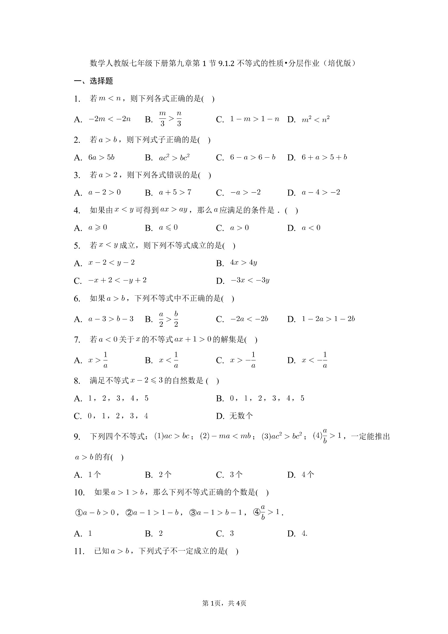 数学人教版七年级下册第九章第1节9.1.2不等式的性质•分层作业(培优版)