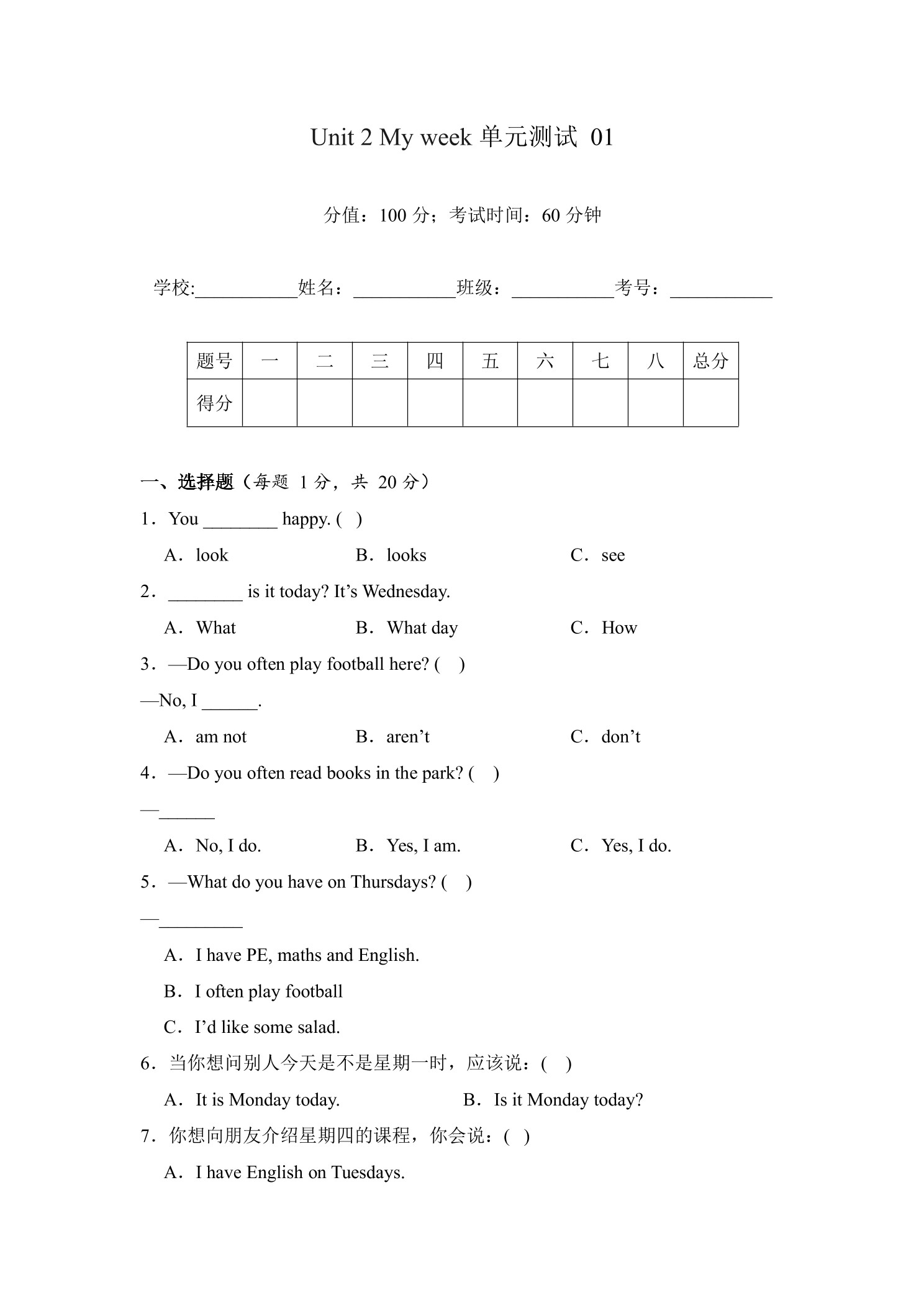 Unit 2 My week 单元测试 01 -人教PEP版(2024)英语5年级上册