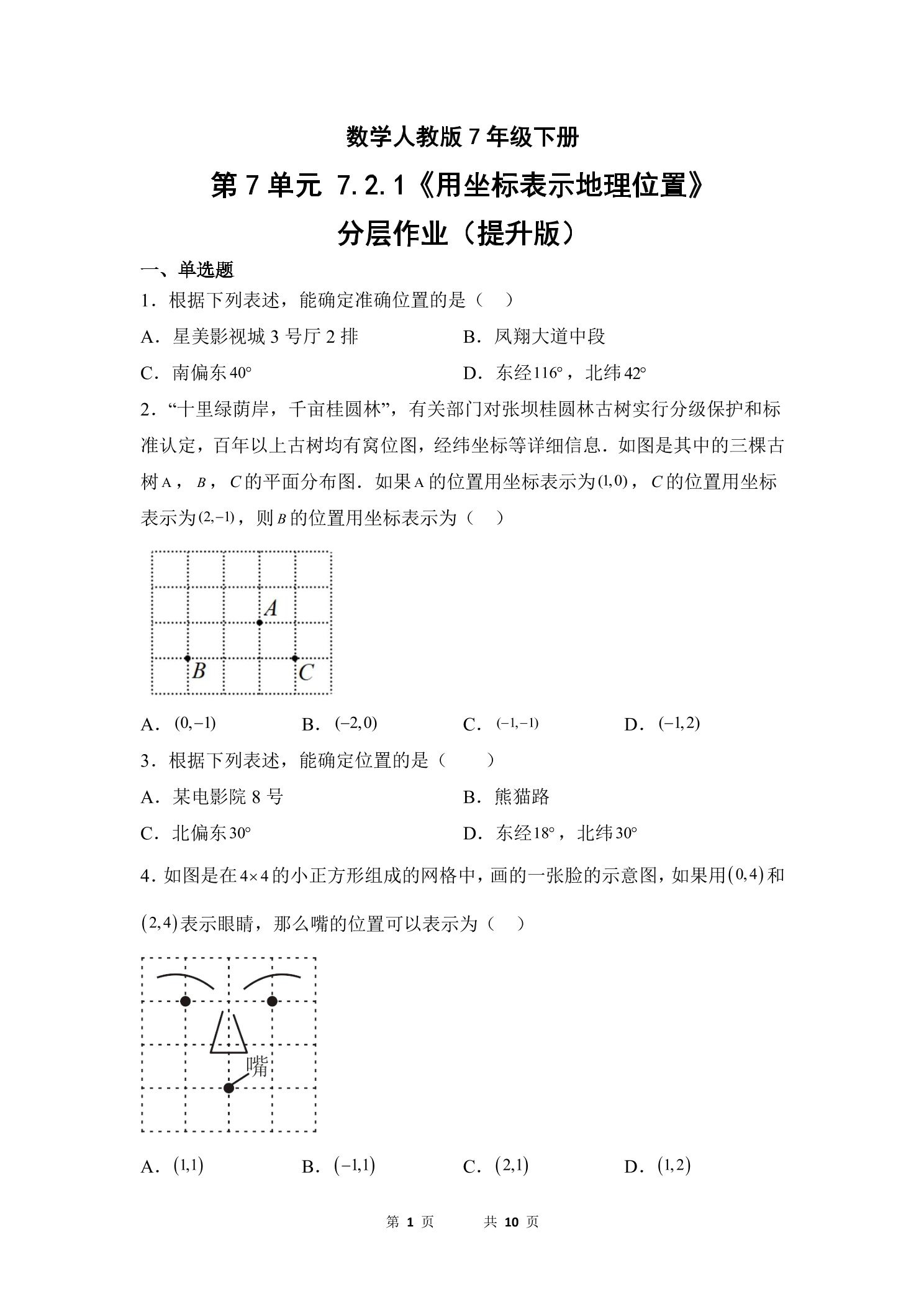 数学人教版7年级下册第7单元7.2.1用坐标表示地理位置分层作业(提升版)