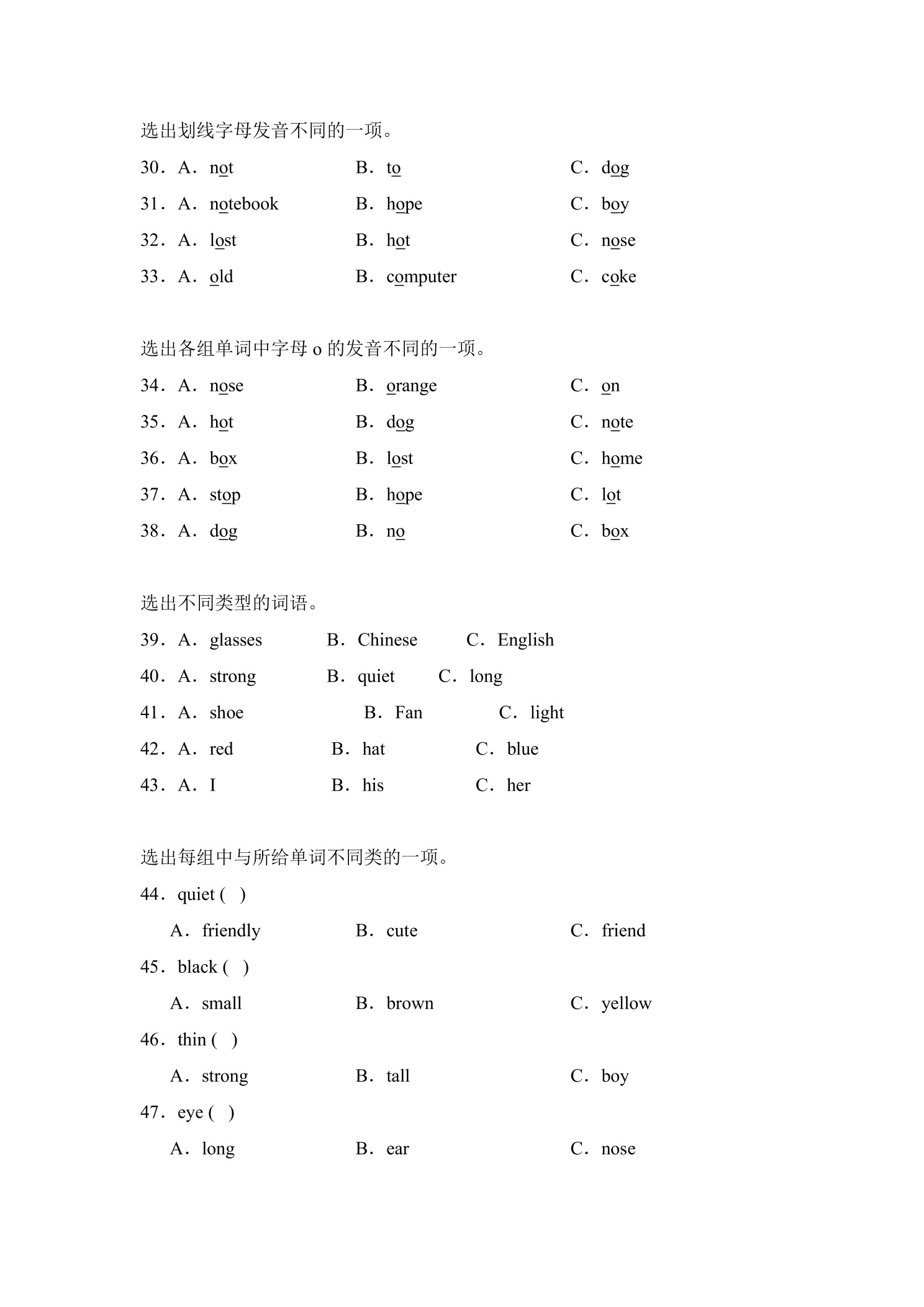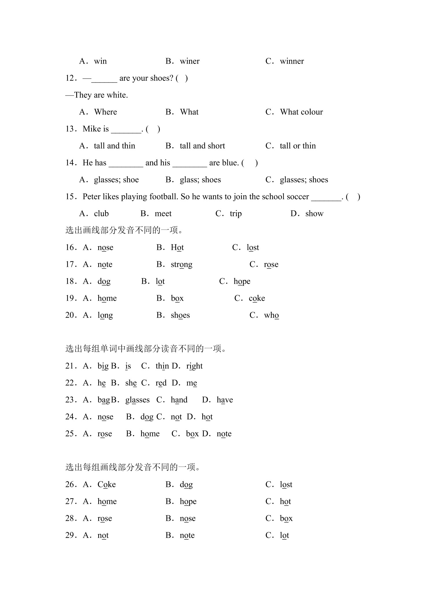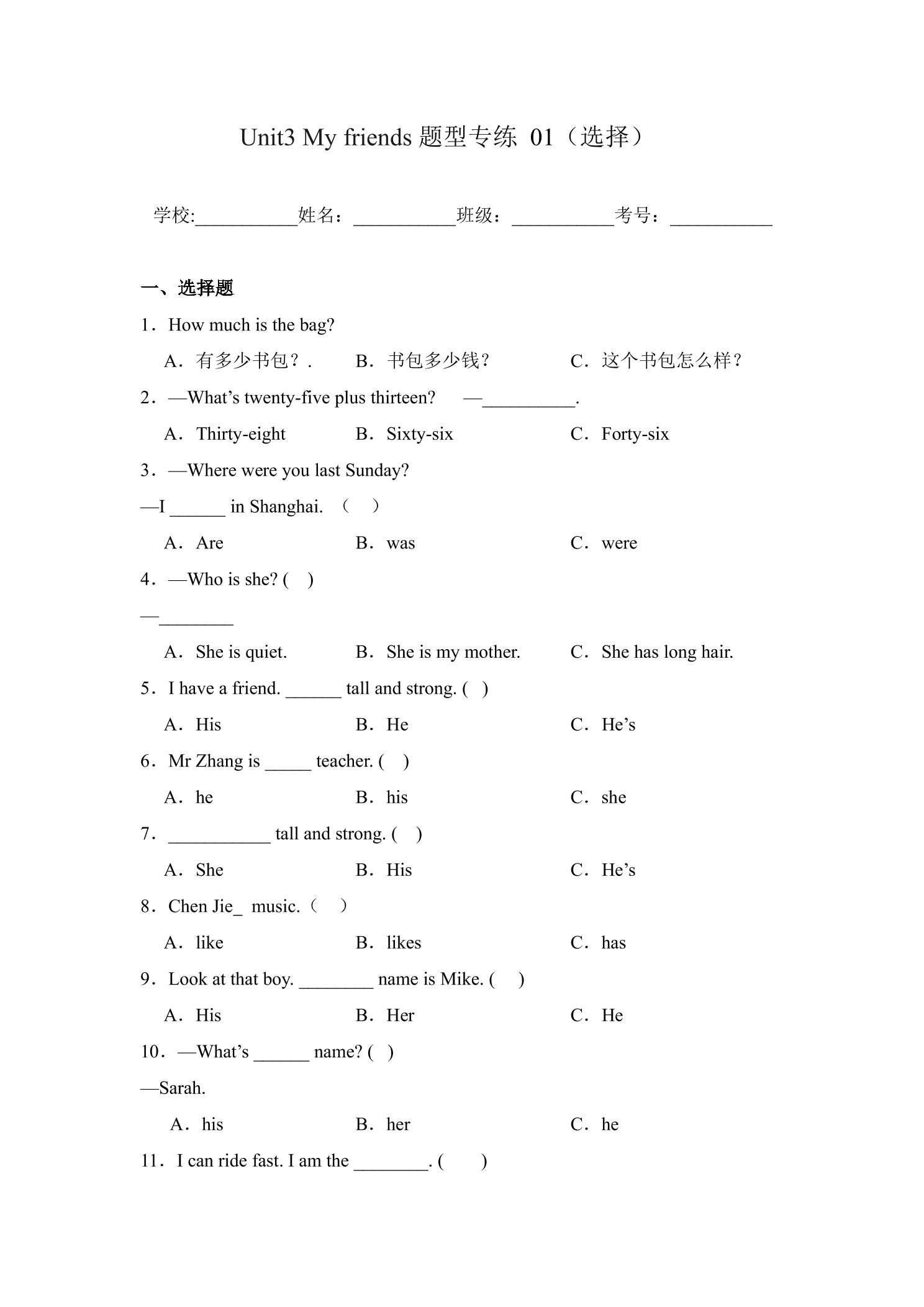 Unit3 My friends题型专练 01(选择)—人教PEP版英语4年级上册