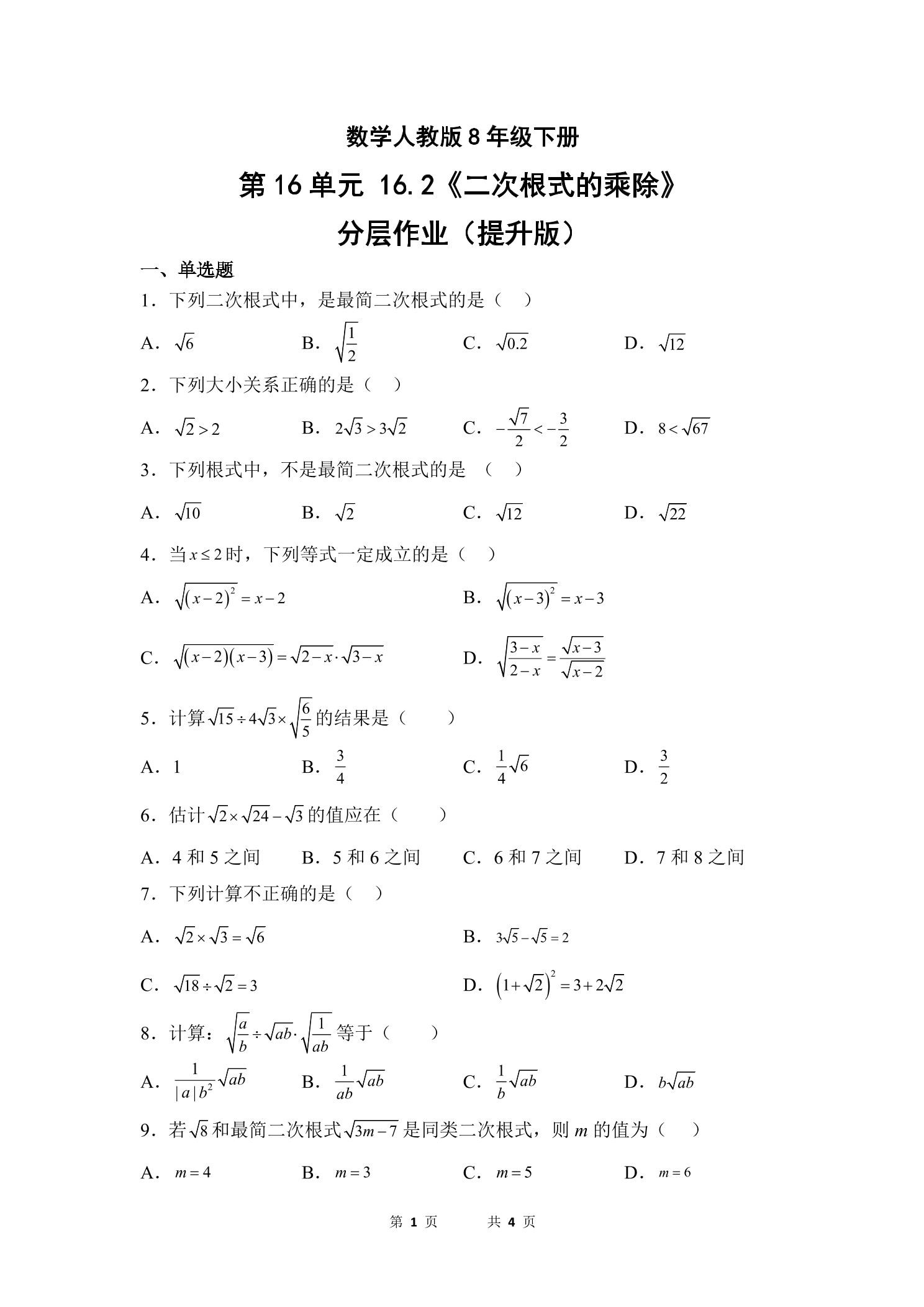 数学人教版8年级下册第16单元16.2二次根式的乘除分层作业(提升版)