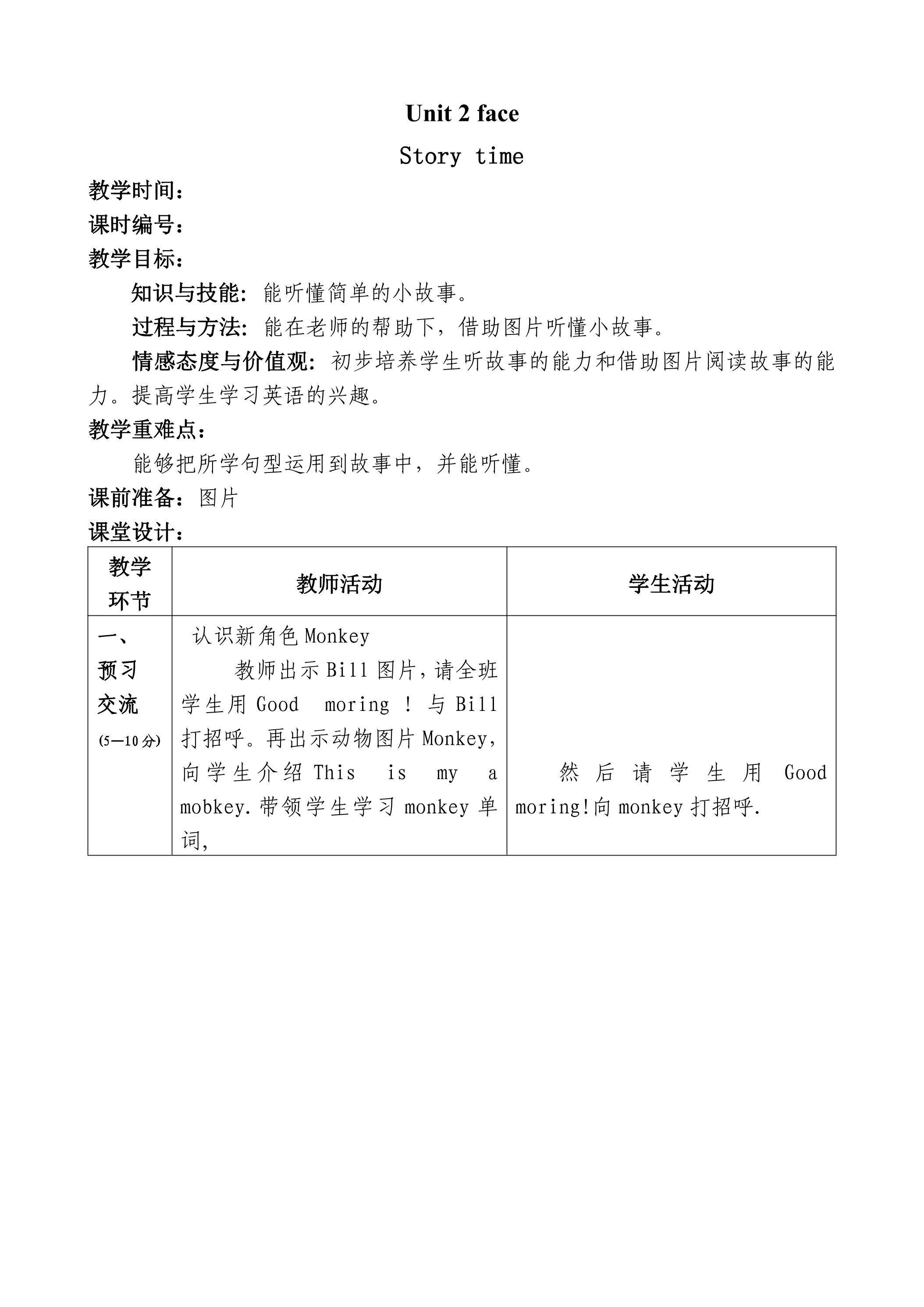 【教案】一年级上册英语人教版新起点Unit 2《Face》(story time)01