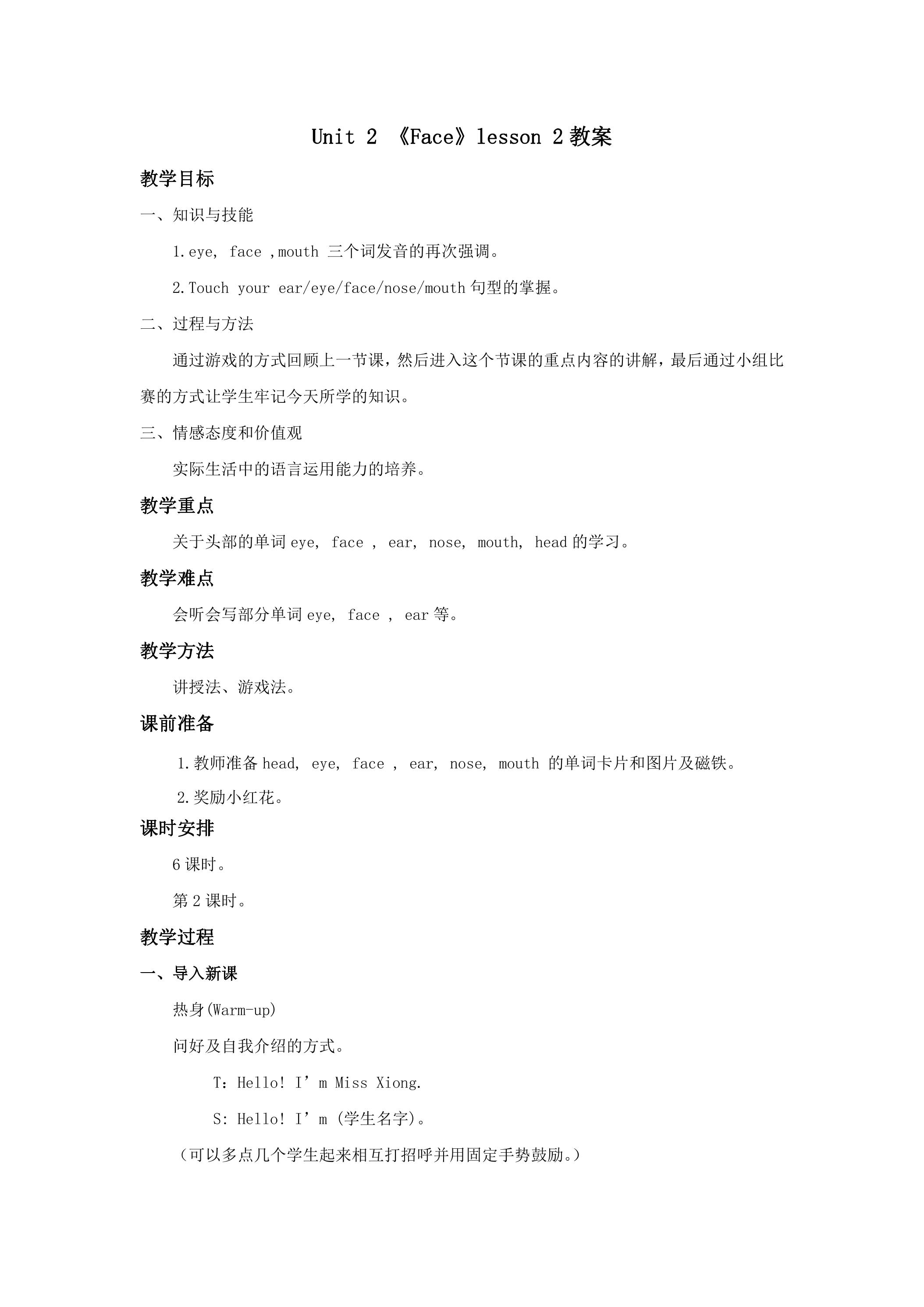 【教案】一年级上册英语人教版新起点Unit 2《Face》(lesson 2)01
