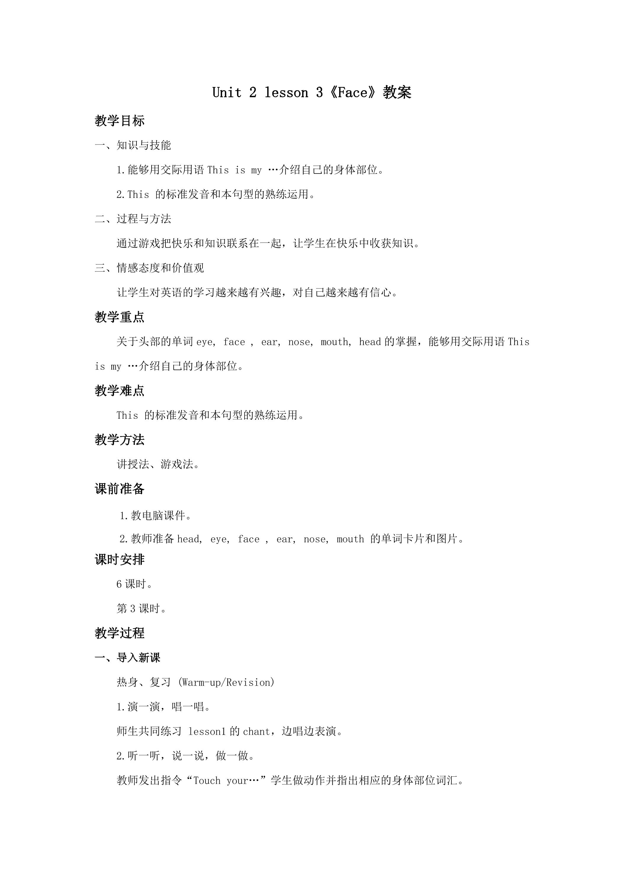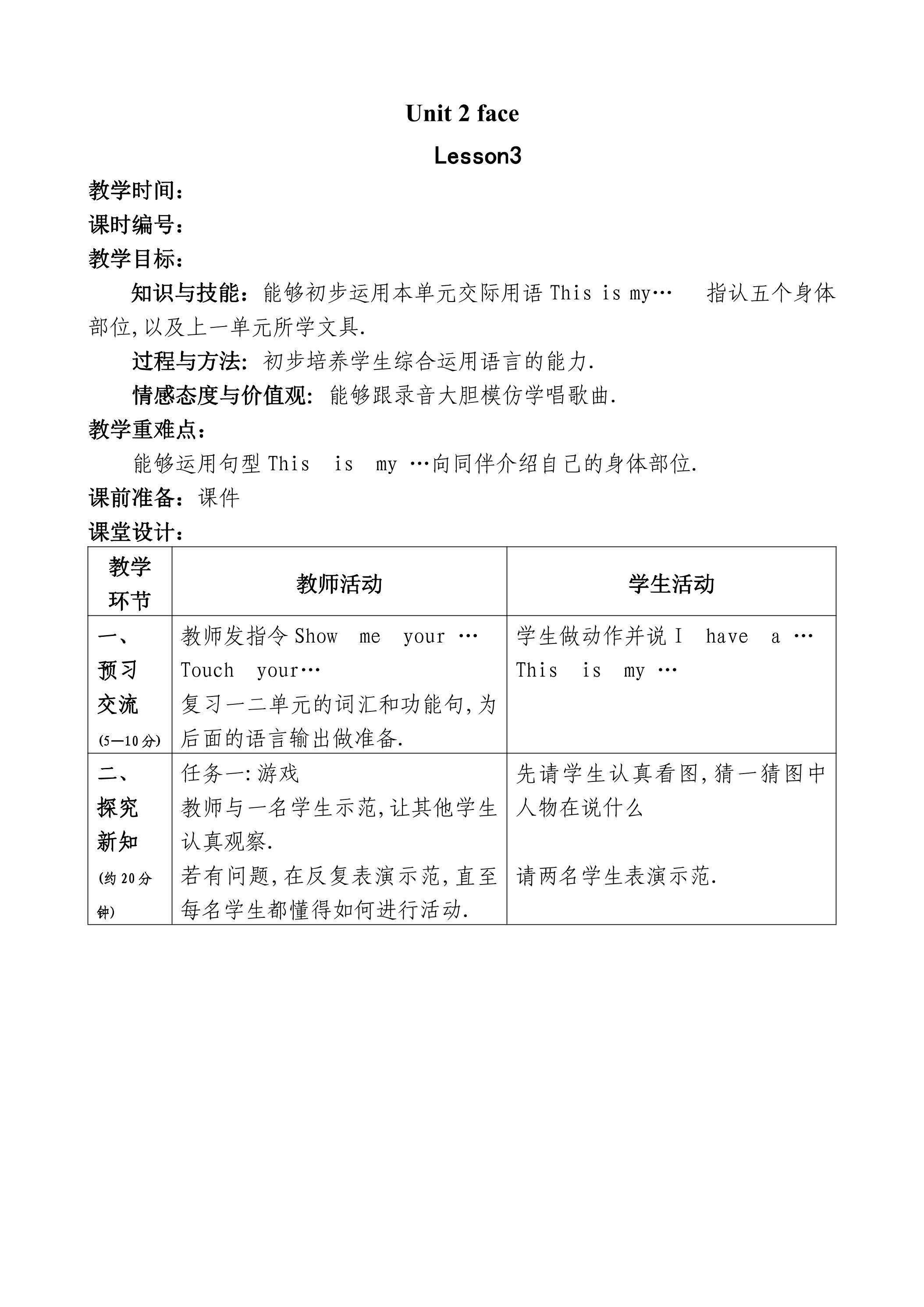 【教案】一年级上册英语人教版新起点Unit 2《Face》(lesson 3)01