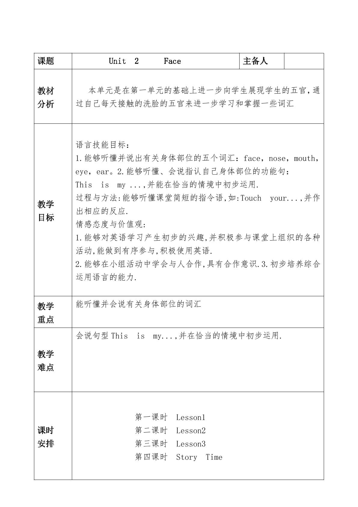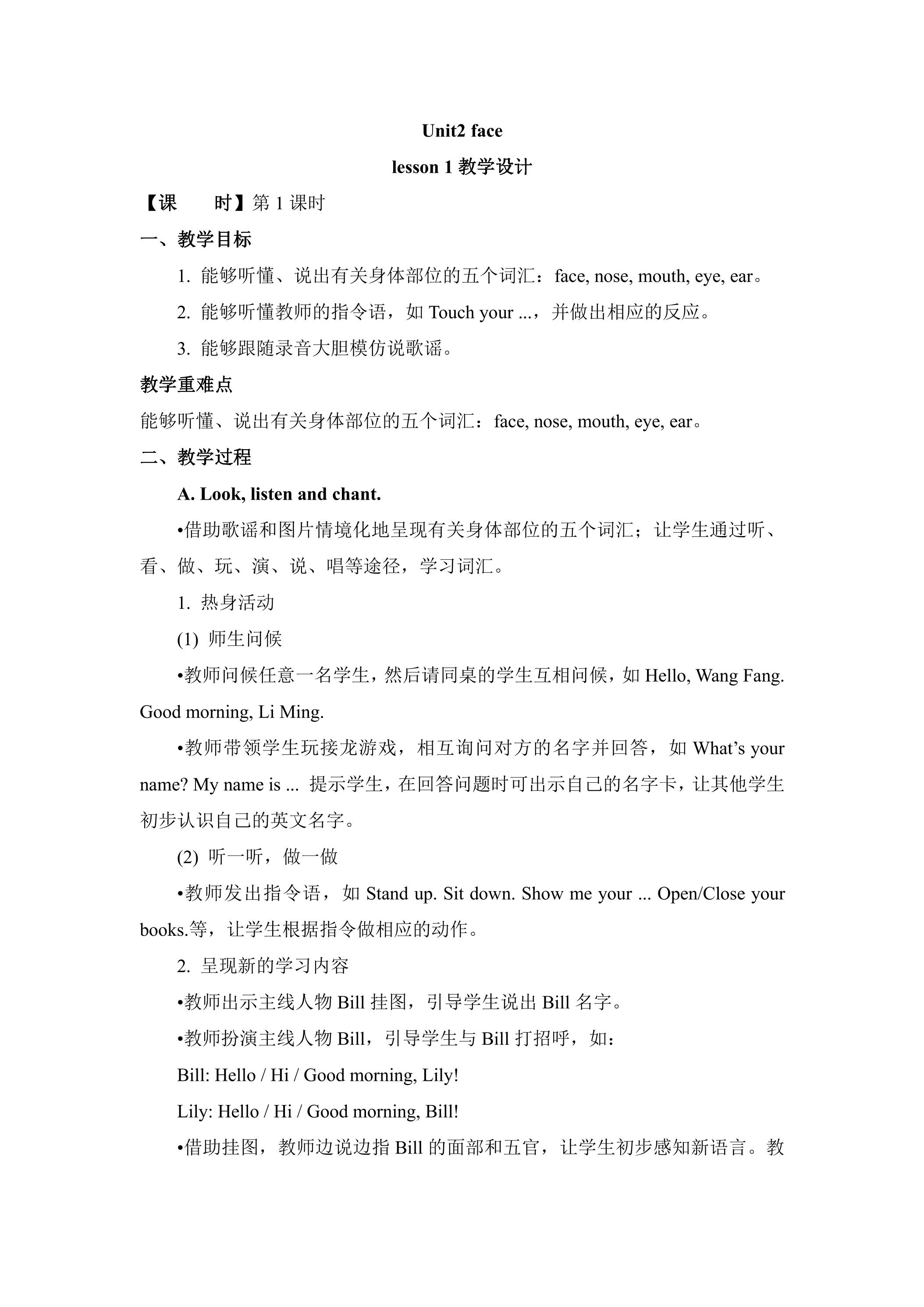 【教案】一年级上册英语人教版新起点Unit 2《Face》(lesson 1)01