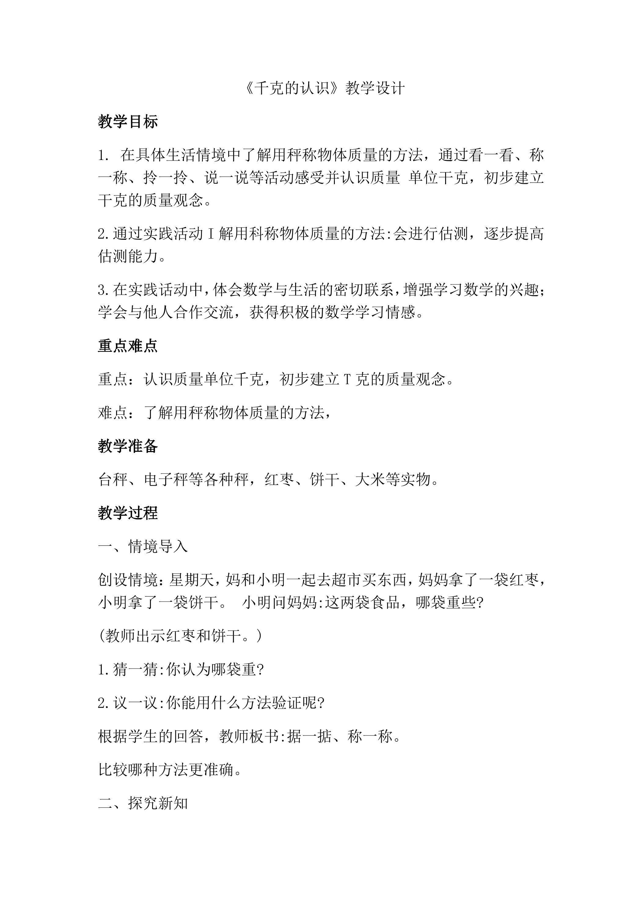 【★★】3年级数学苏教版上册教案第2单元《千克和克》