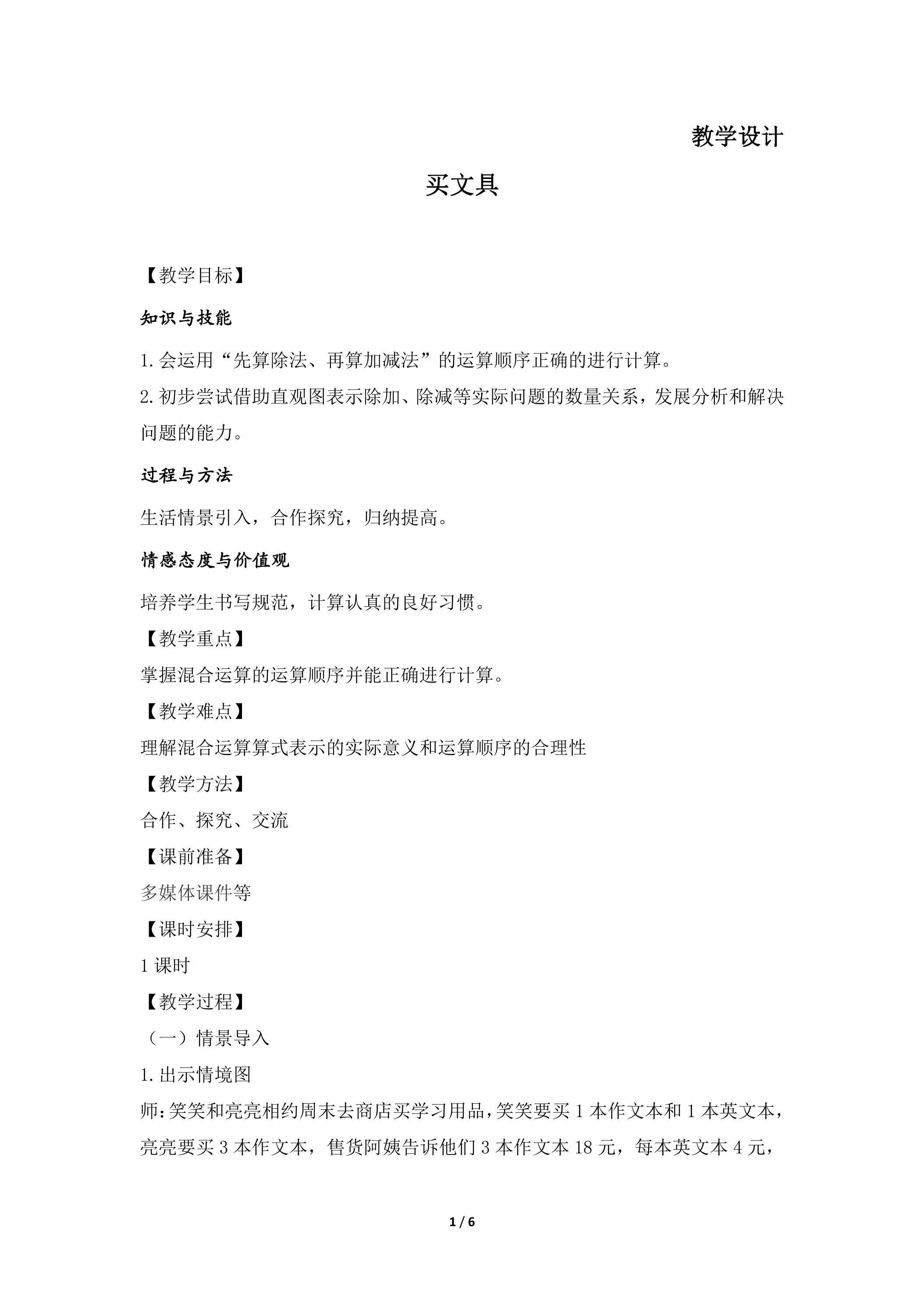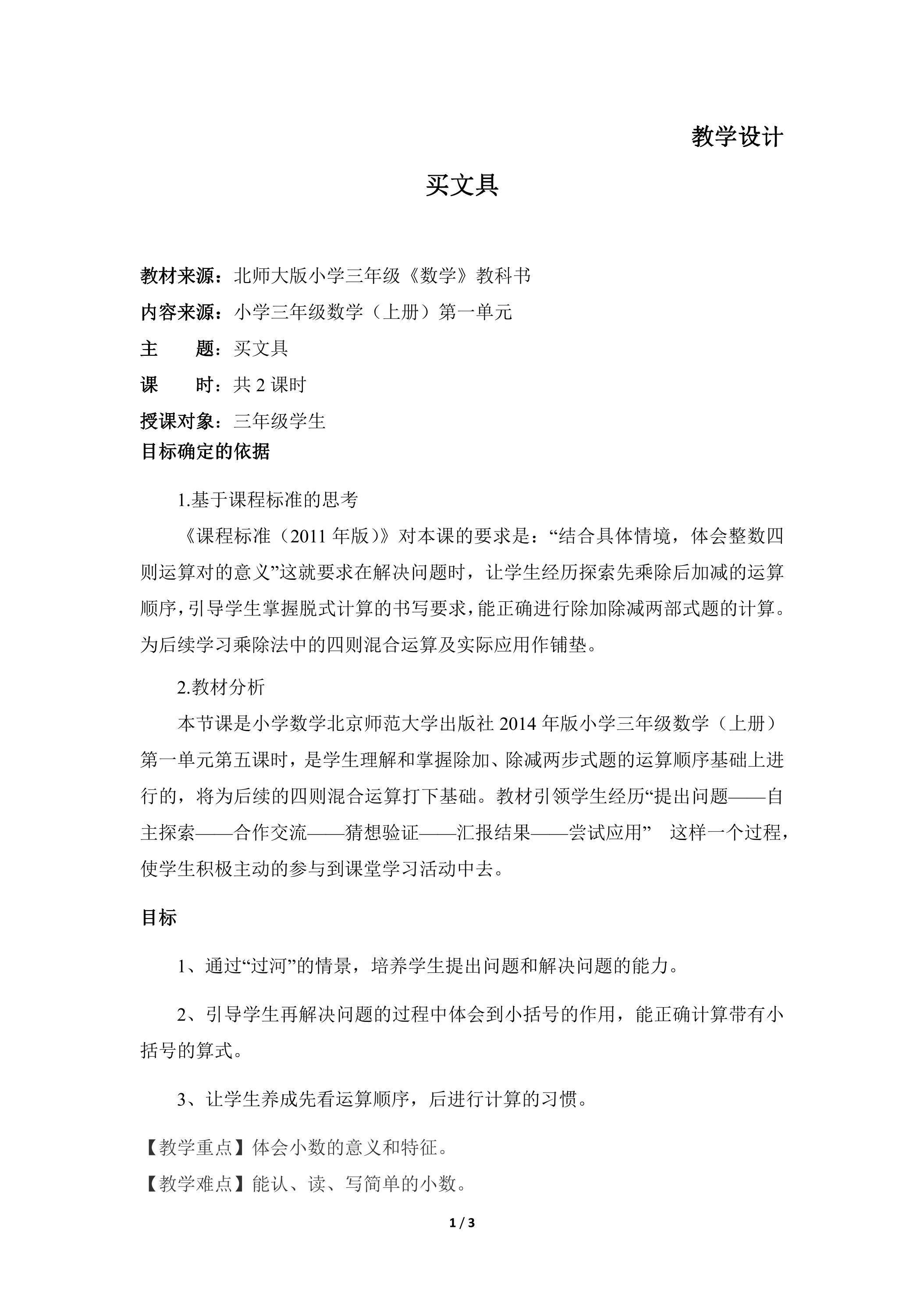 【★★】3年级数学北师大版上册教案第1章《买文具》