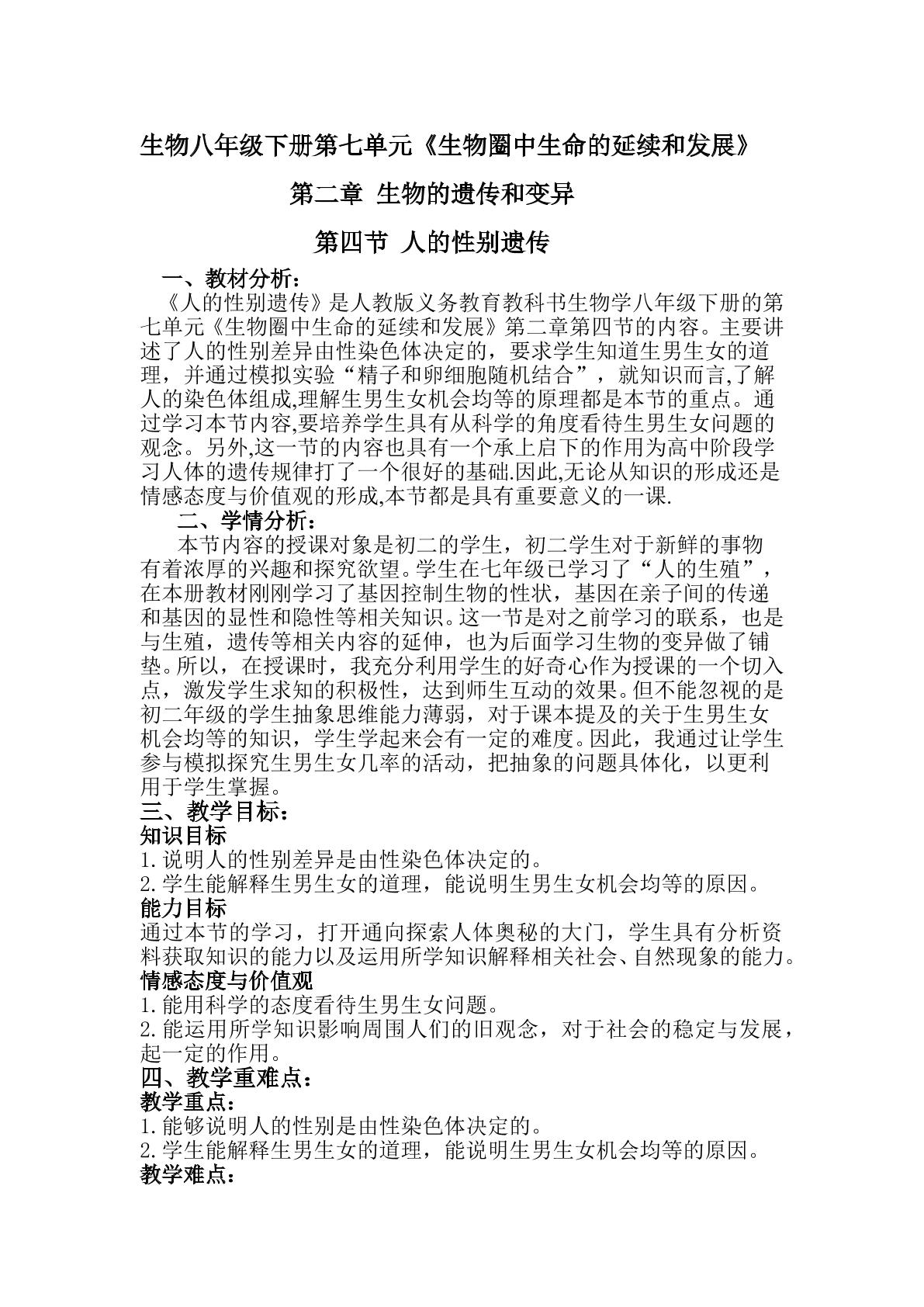 人教版生物学八年级下册 第七单元第二章生物的遗传和变异 第四节人的性别遗传