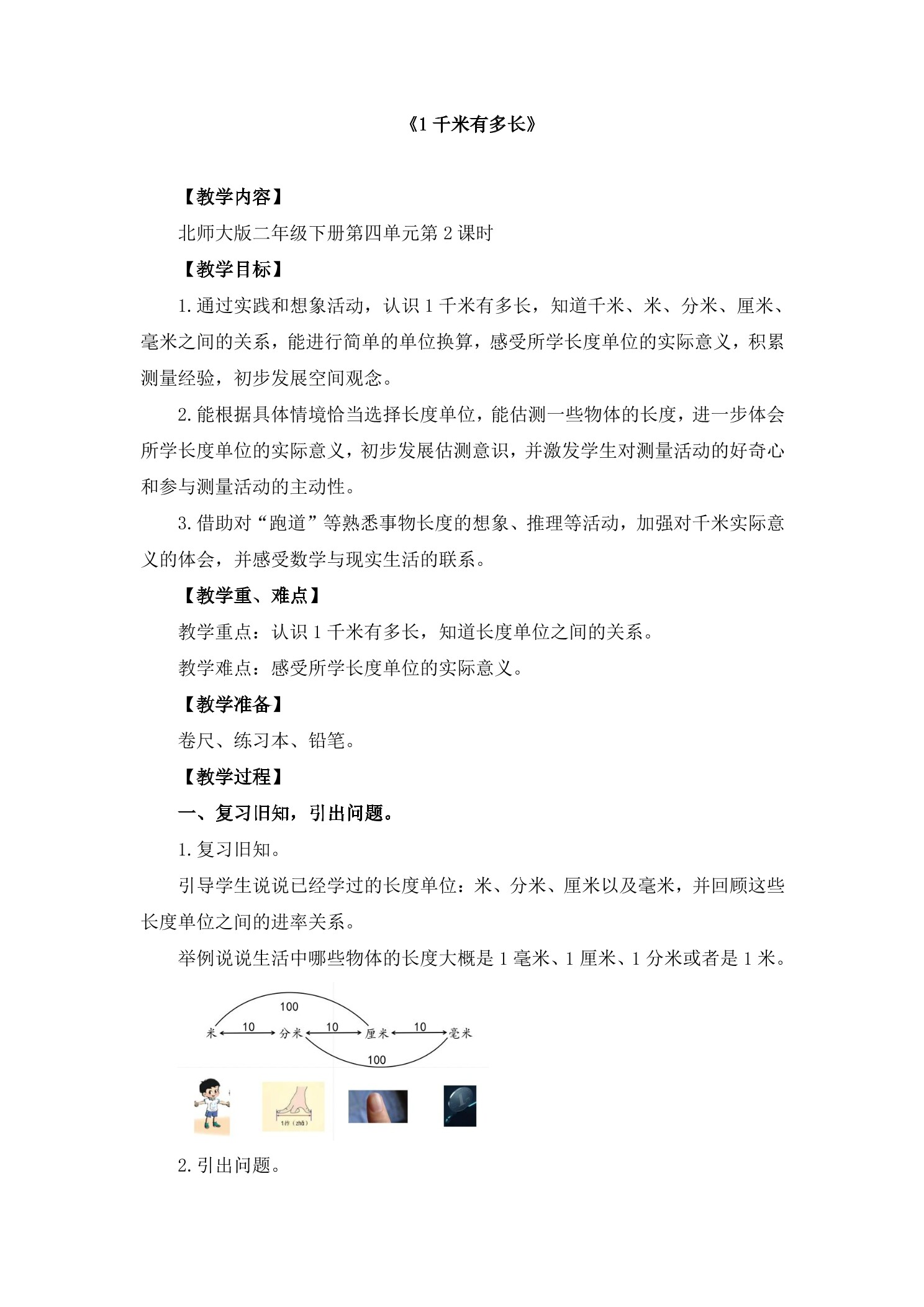 【★★★】2年级数学北师大版下册教案第4单元《4.2 1千米有多长》