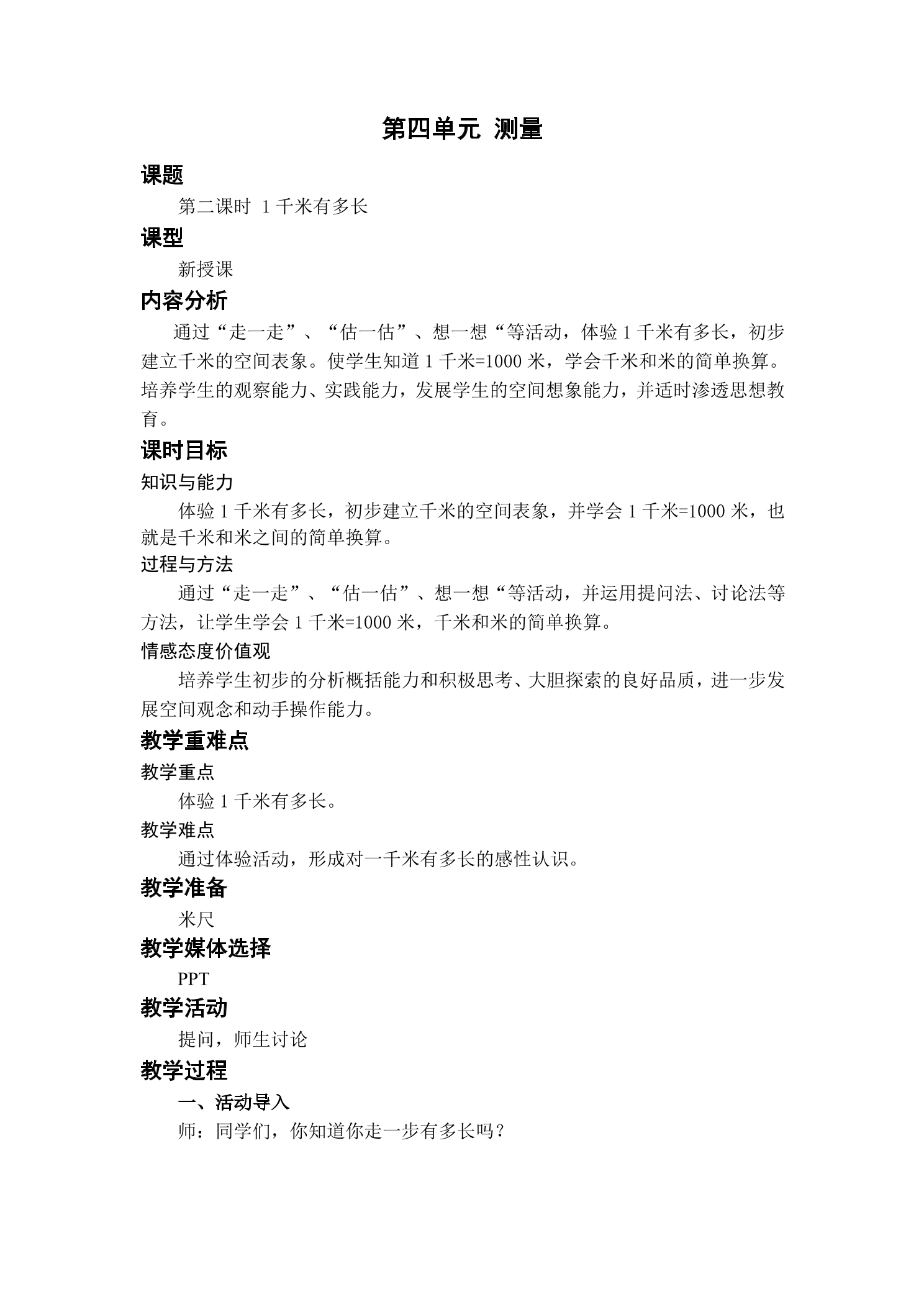 【★★】2年级数学北师大版下册教案第4单元《4.2 1千米有多长》