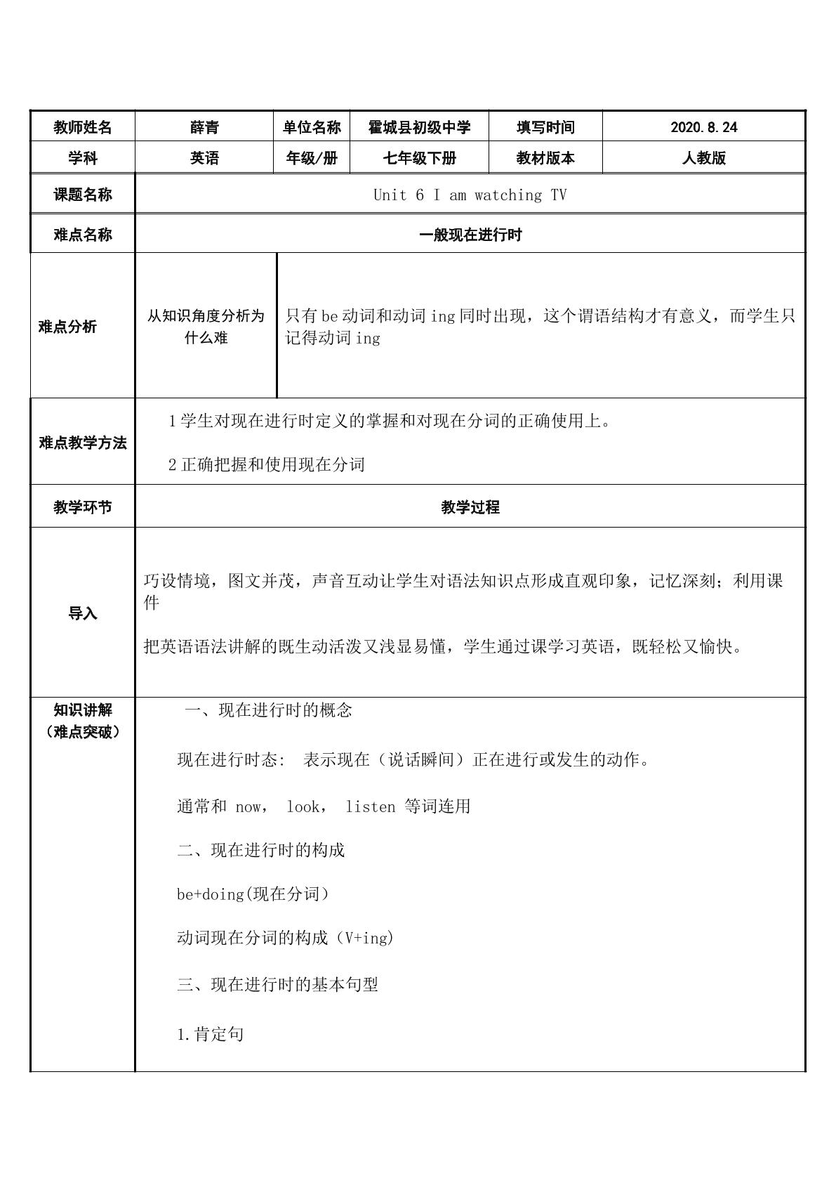人教版七年级下册 Unit 6 I am watching TV.