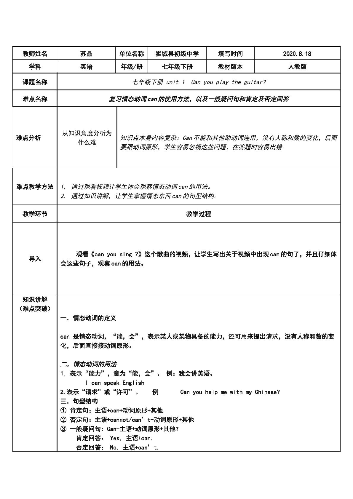 微课Unit1 Can you play the guitar ?(示范课例)