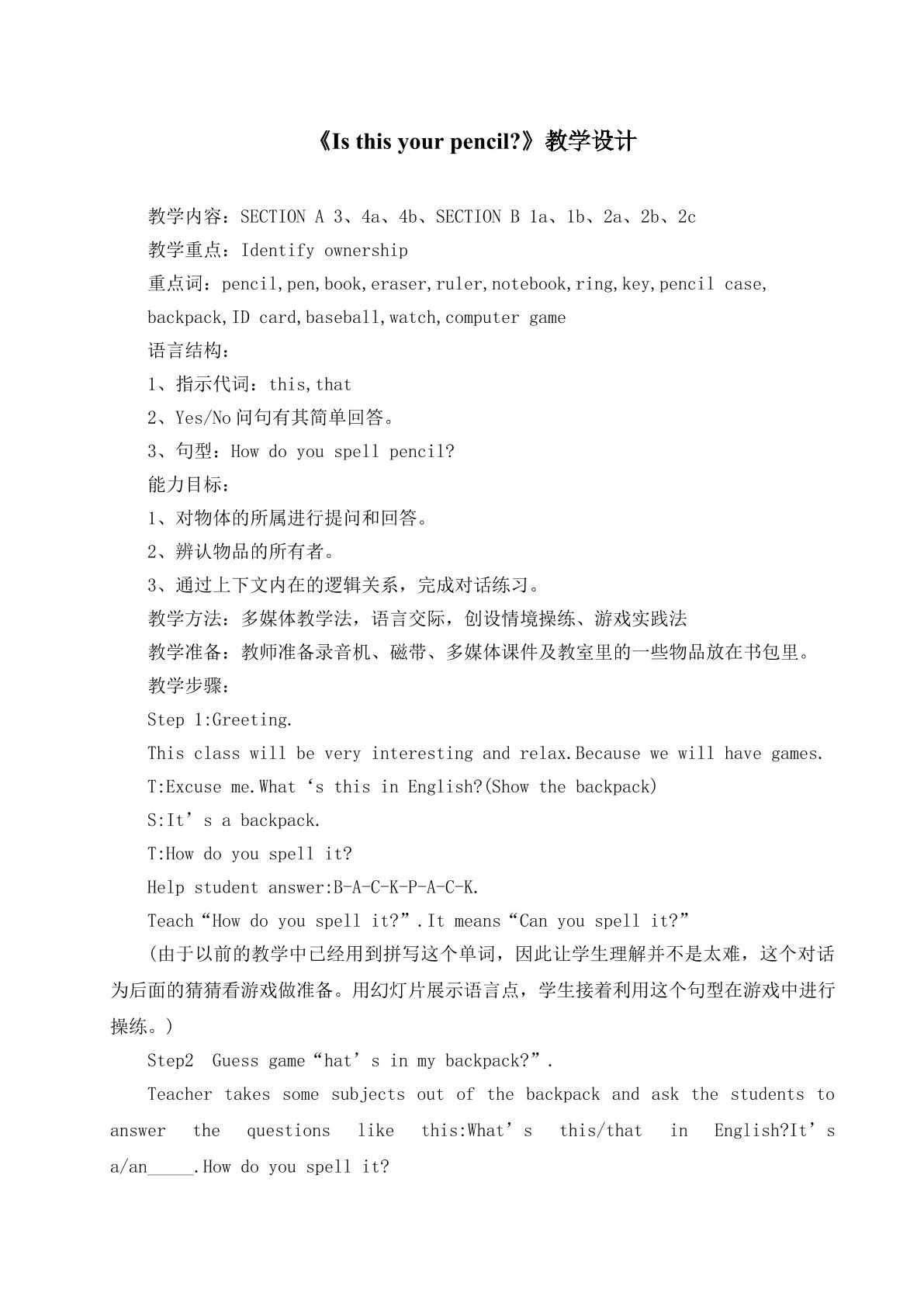 七上 unit3 Is this your pencil?