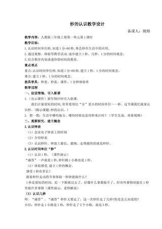 人教版数学三年级上册第一单元第1课时《秒的认识》微课。整堂课从创设情境导入课程,在认识秒的过程中,以学生为主体,认真观察、探究、体验、实践亲身感受15秒、20秒、60秒的长度。在游戏中学习知识,让学生真正认识秒,知道1分=60秒,体会到秒在生活中的应用。