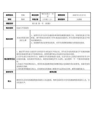 标签: 网龙、 教学资源、 1级、 教学设计、 文档、 重难点教案、 2020年后赛事资源、 ZYK、 有重难点、 人民教育出版社(人教版)、 重难点试点、 ZYKB、 教案、 物理、 正规教育、 教案、 K12、 初中、 101教育PPT成套资源、 素材类型、 八年级、 有课件教案微课、 上册、 有知识点、 托盘天平的使用及读数