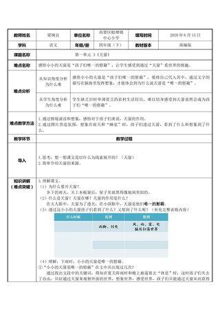 标签: 网龙、 优选、 教学资源、 三等奖、 新、 1级、 四年级、 教学设计、 高效备授课、 文档、 重难点教案、 2020年后赛事资源、 ZYK、 下册、 小学、 语文、 人民教育出版社(人教版部编版)、 ZYKB、 教案、 正规教育、 教案、 K12、 获奖教案、 101教育PPT成套资源、 素材类型
