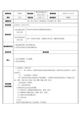 标签: 网龙、 教学资源、 教案、 三等奖、 新、 正规教育、 教案、 1级、 教学设计、 文档、 K12、 获奖教案、 重难点教案、 2020年后赛事资源、 ZYK、 101教育PPT成套资源、 下册、 素材类型、 小学、 语文、 人民教育出版社(人教版部编版)、 ZYKB、 二年级