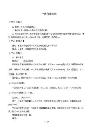 这是一套关于《一次同余方程》的素材,格式为DOCX,文件大小为0.04 MB,页数为2页,请使用101教育PPT软件打开使用;